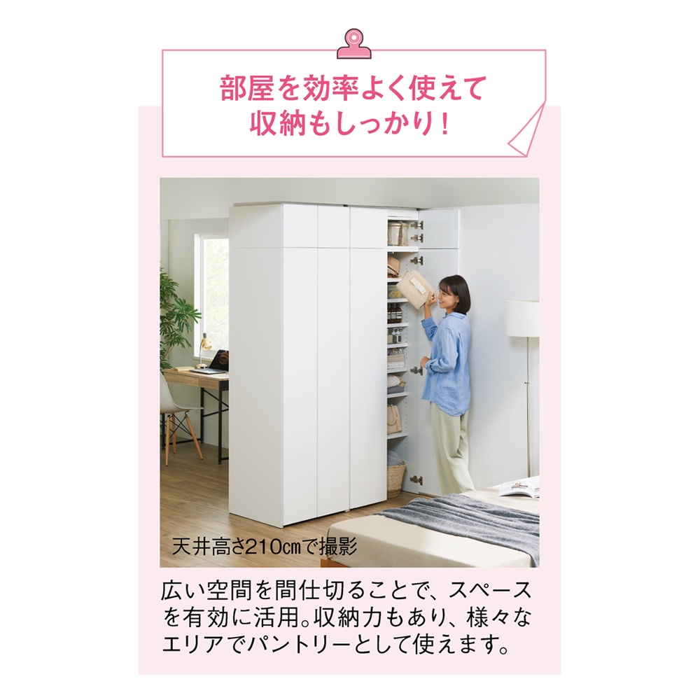 空間を間仕切りながら、大容量収納まで叶えてくれる間仕切り収納。背面が美しい化粧仕上げで、空間を間仕切って使うことができます。