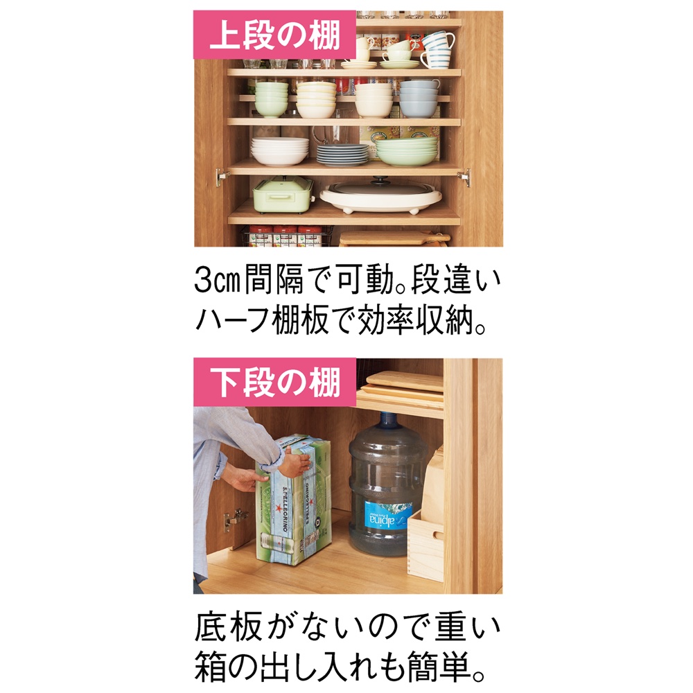 ◆上部は、前後で高さが変えられる段違い棚。3cm間隔で高さ調整できます。◆下段の棚は可動式。3cm間隔で高さ調整可能。