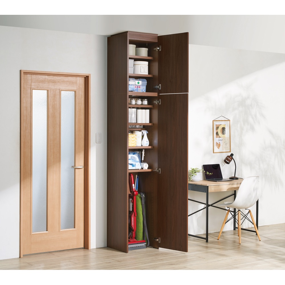コーディネート例(ウ)ダークブラウン 床から固定棚まで90cmの高さがあり掃除機なども収納可能。 ※写真は天井高さ250cmで撮影 ※写真は本体幅45奥行45cm(上置き設置)