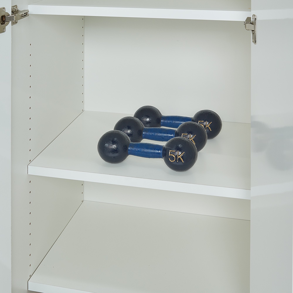 使用イメージ(ア)ホワイト 底板がなく段差レスなので重いものの出し入れもラク。固定棚から上は使いやすい段違い棚。 ※写真は本体幅75奥行56cm