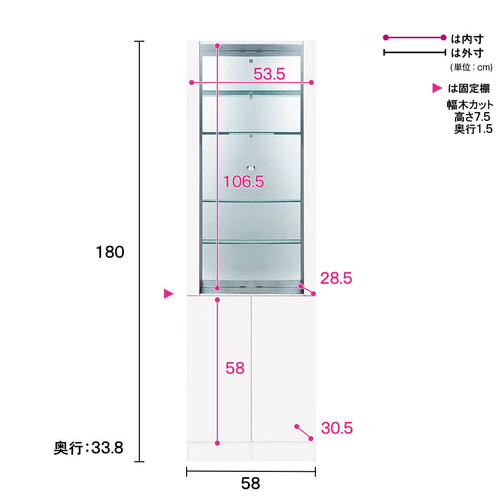 美しくしまうハイクラス壁面収納シリーズ 収納庫 LED付きガラス扉 ガラス棚 幅58cm コレクションケース ディスプレイラック 飾り棚 本棚 ラック シェルフ 631408