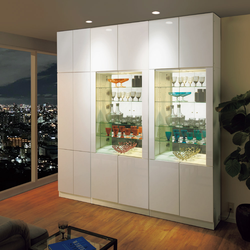ガラス扉で「見せる」「ほこり対策」を両立。ライトの光が透過し収納部に広がるガラス棚。グラス等を引き立てます。