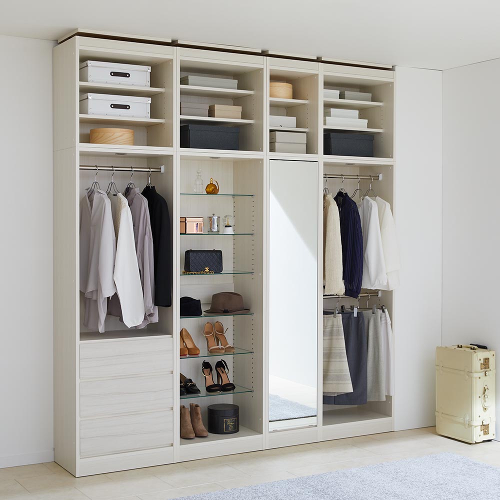豊富なラインナップで、上質感漂うショップのようなクローゼットをコーディネート。オープンワードローブ本体と別売りで上置きをご用意しております。