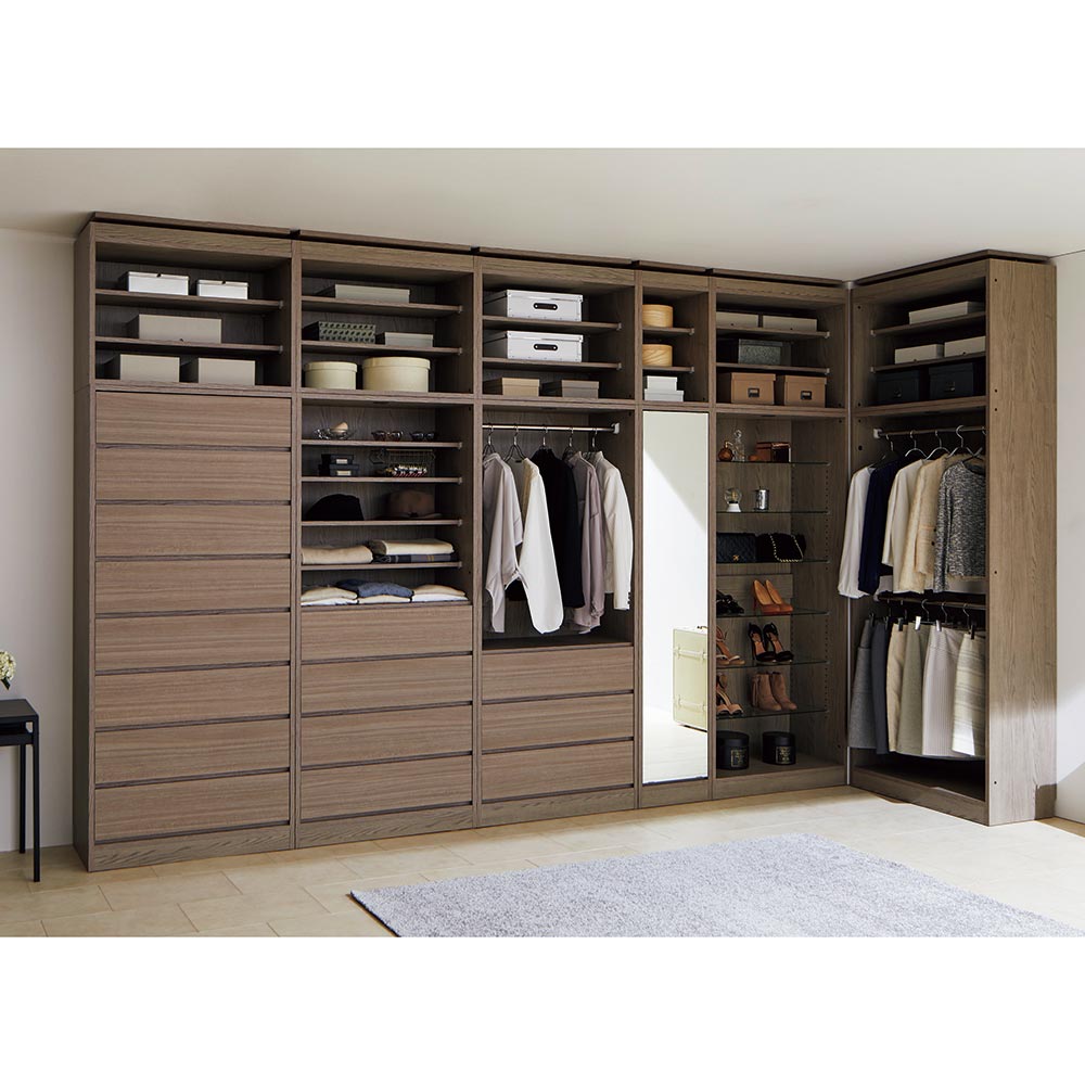 豊富なラインナップで、上質感漂うショップのようなクローゼットをコーディネート。オープンワードローブ本体と別売りで上置きをご用意しております。