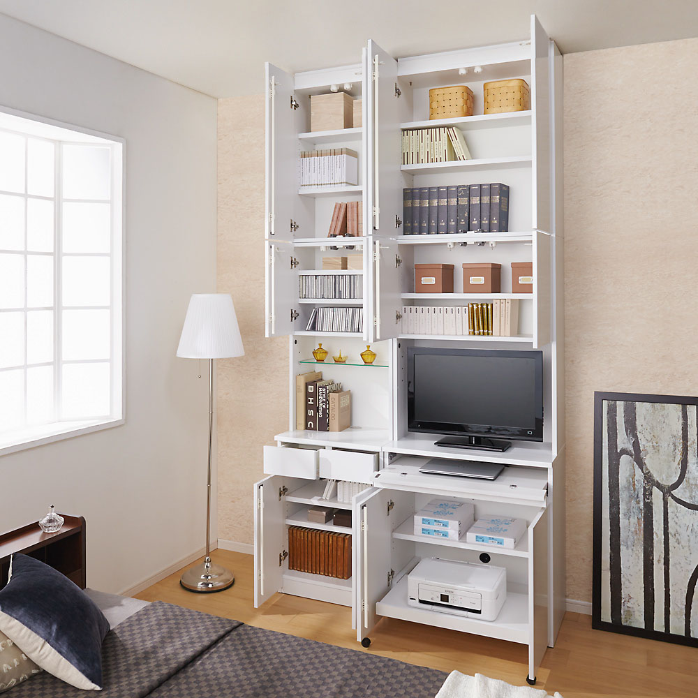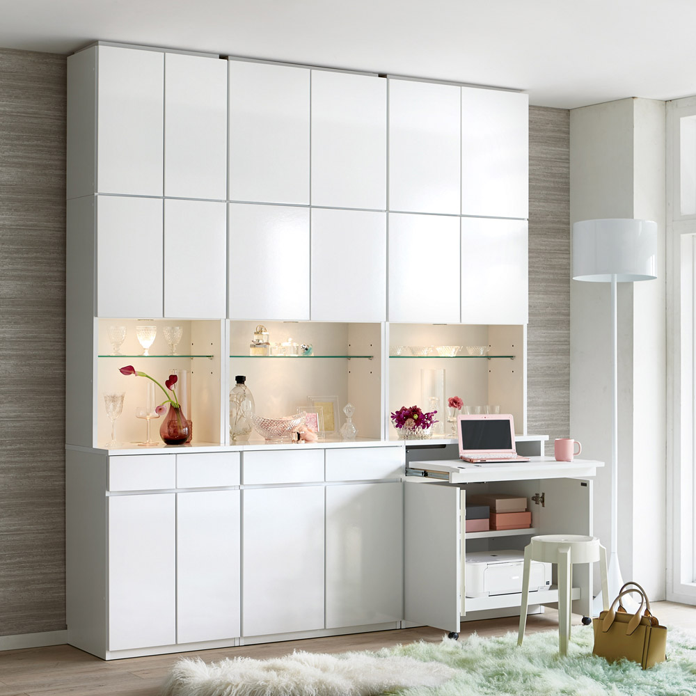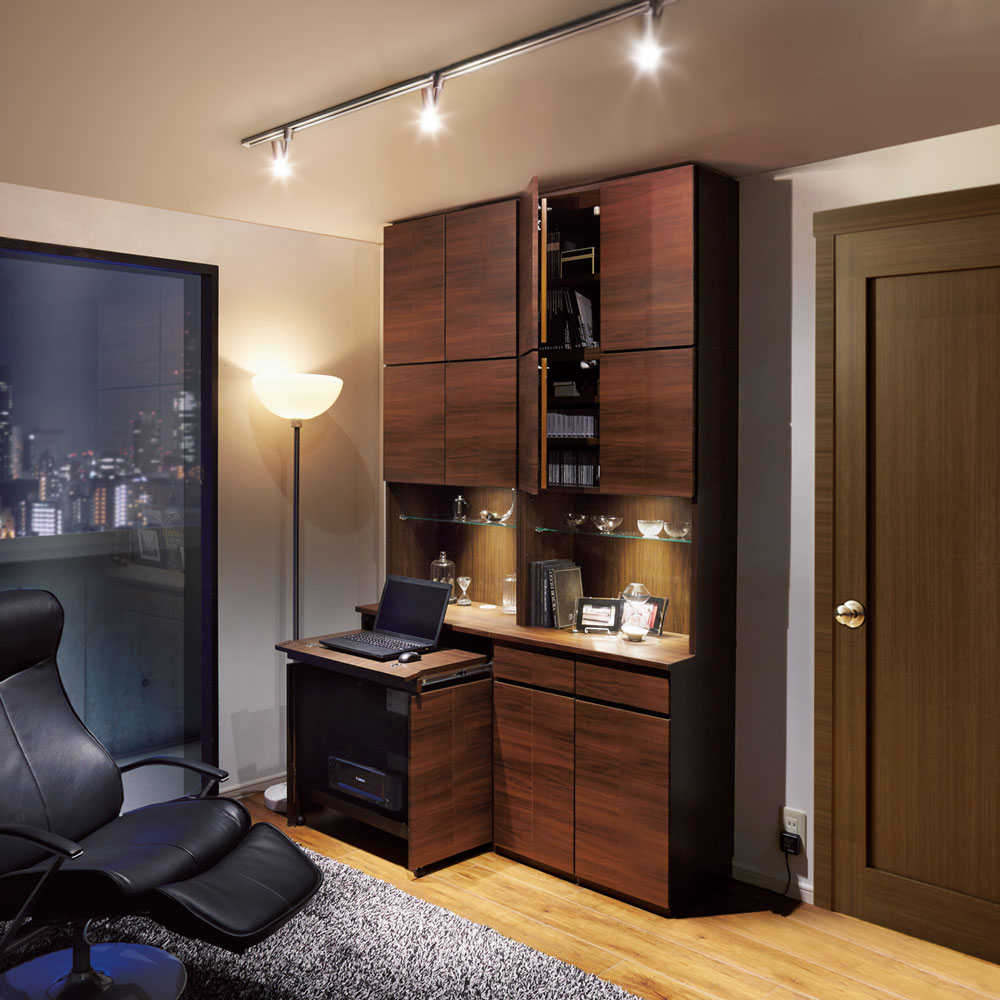◆自宅に居ながら高級レストランの雰囲気に酔いしれたい…そんな思いをかなえるブックラック&パソコンデスクシリーズです。◆収納庫に搭載されたLEDライトが、ガラス棚を美しく照射するディスプレイラック。