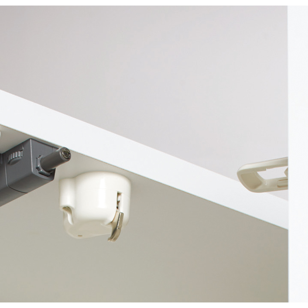 ◆扉はスッキリとした印象のプッシュ式。お手入れもしやすい素材です。◆上段の扉には耐震ラッチを装備、安心の造りです。