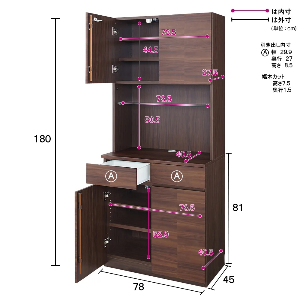 ■上部扉有効内寸:幅73.5奥行27.5高さ44.5cm