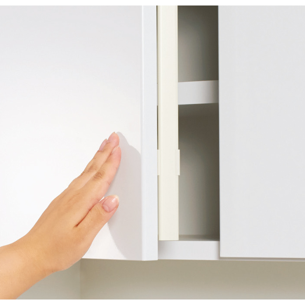 ◆扉はスッキリとした印象のプッシュ式。お手入れもしやすい素材です。◆上段の扉には耐震ラッチを装備、安心の造りです。