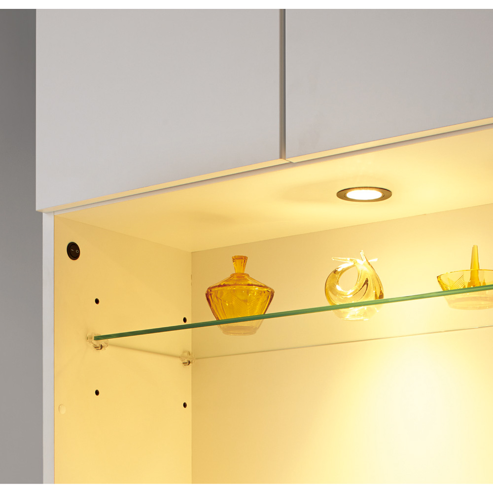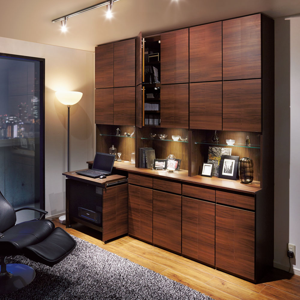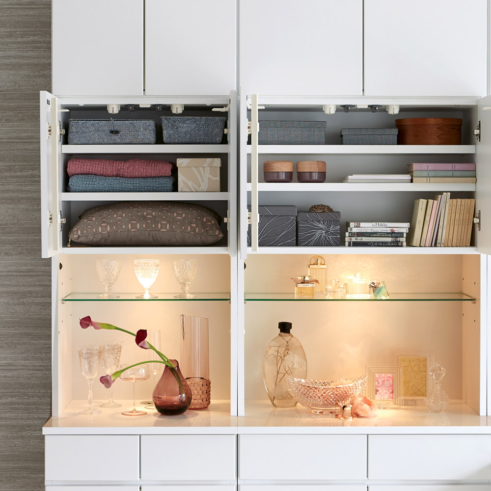 見せたくないものはすっきり隠して収納。お気に入りのグラスやオブジェはライトが美しく照らすスペースでディスプレイ。