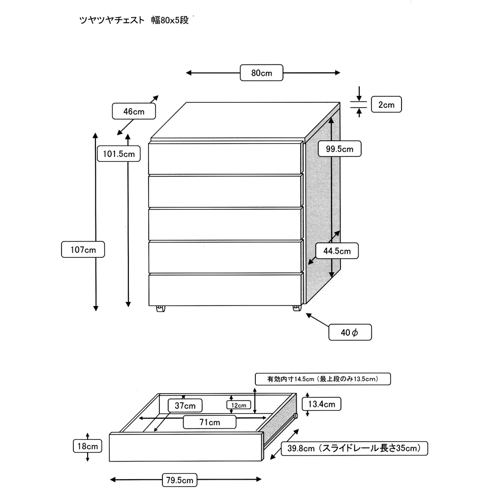■幅80奥行46高さ107、引き出し奥行37cm・重量約34kg