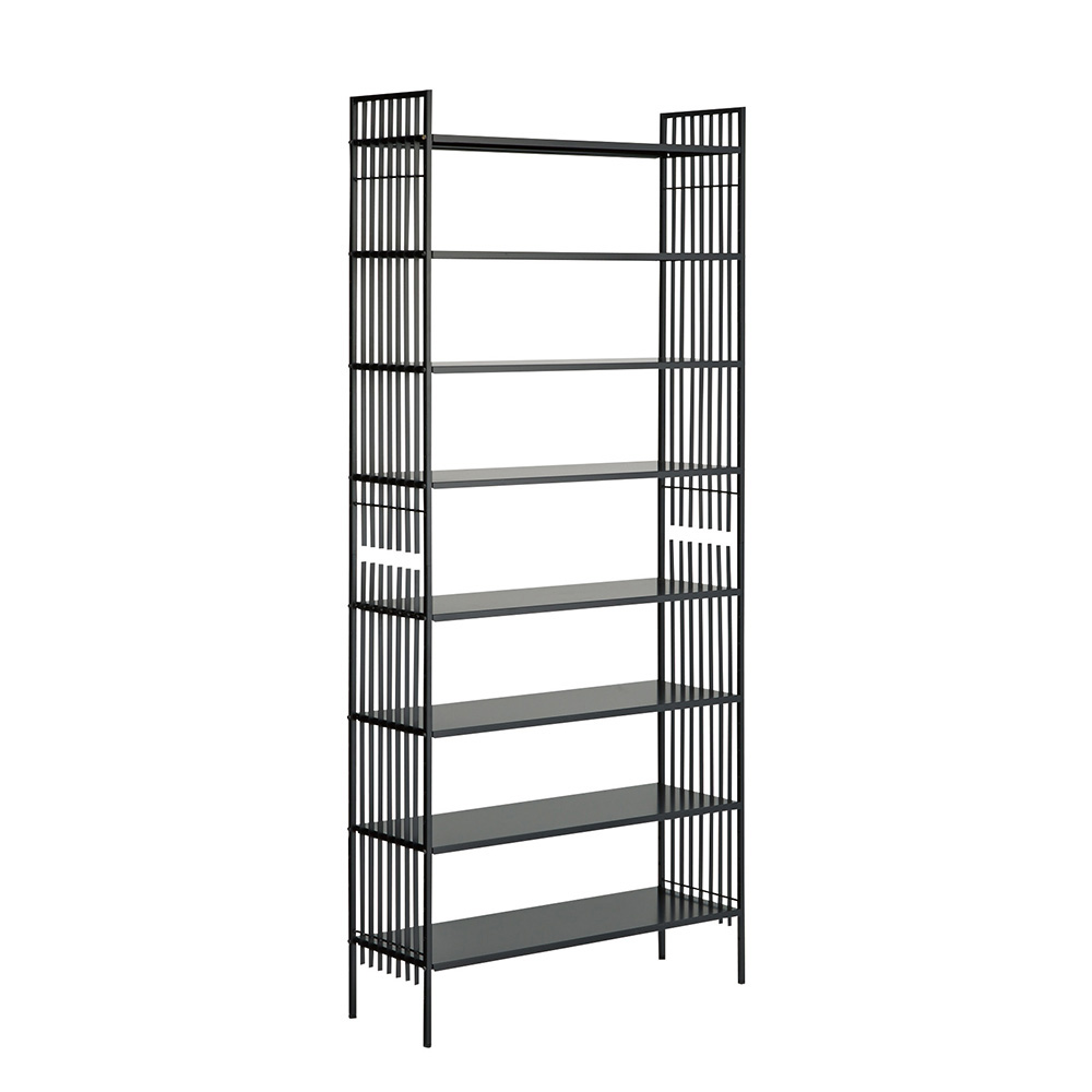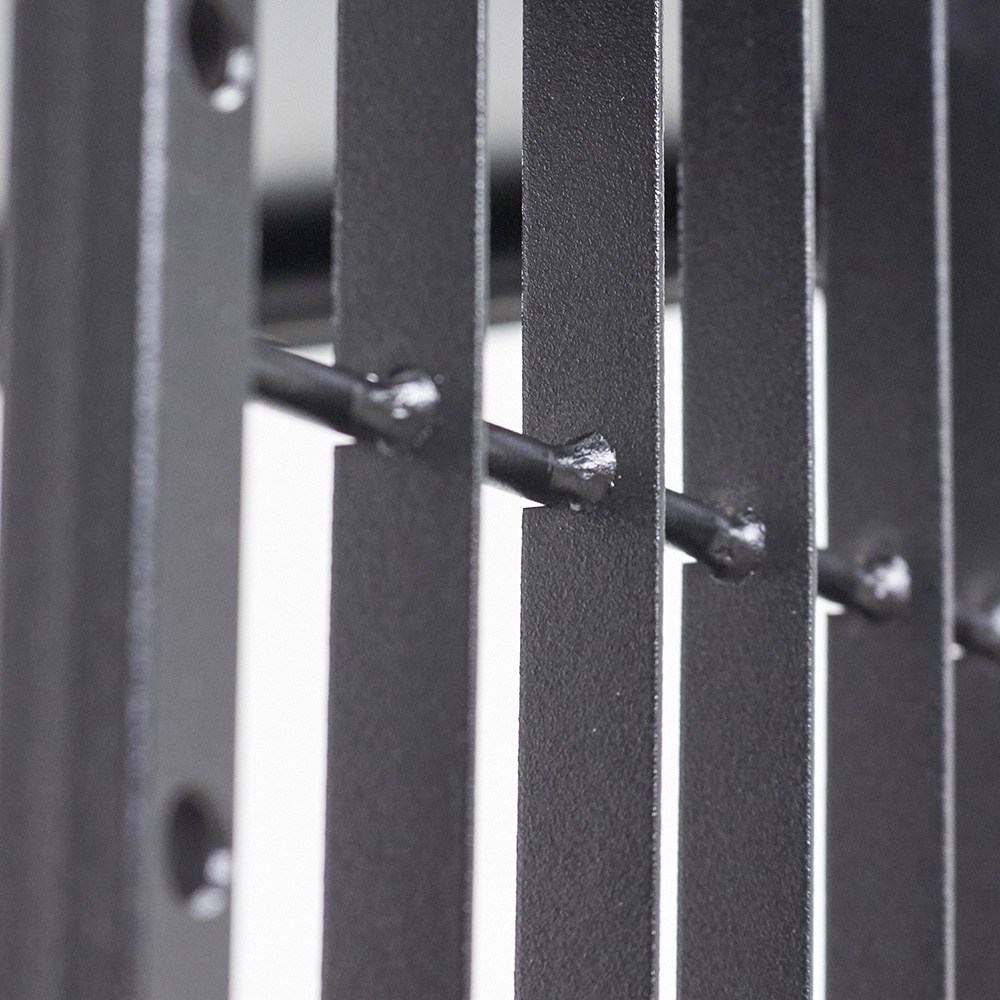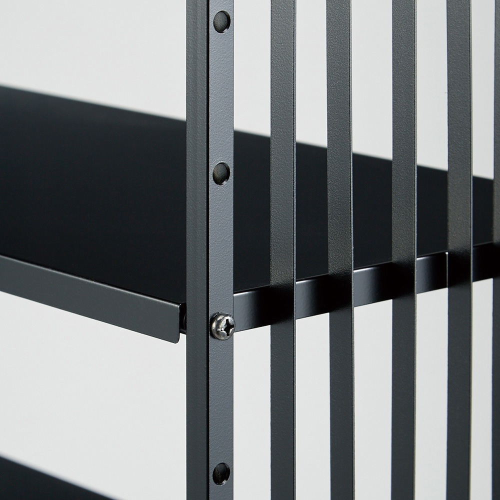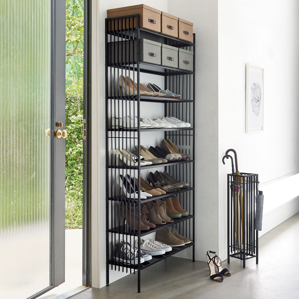 ブラックのシャープな格子柄がすっきりとした印象を与えるシューズラック。細身のストライプの線が縦に長く、天井を高く見せる効果も。