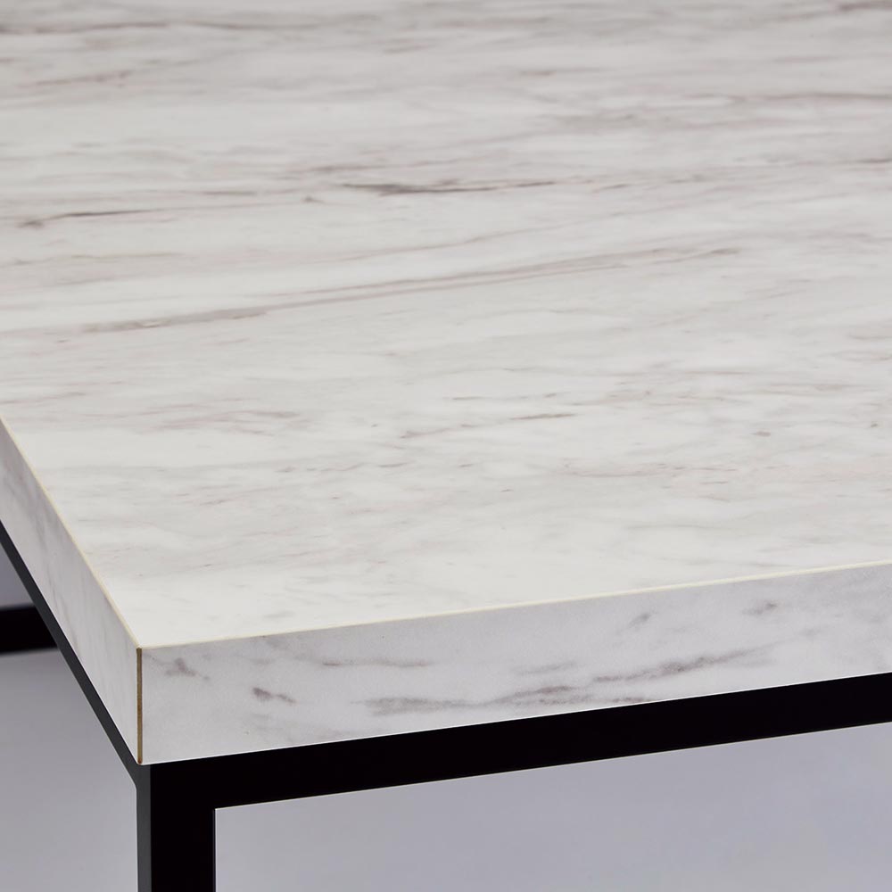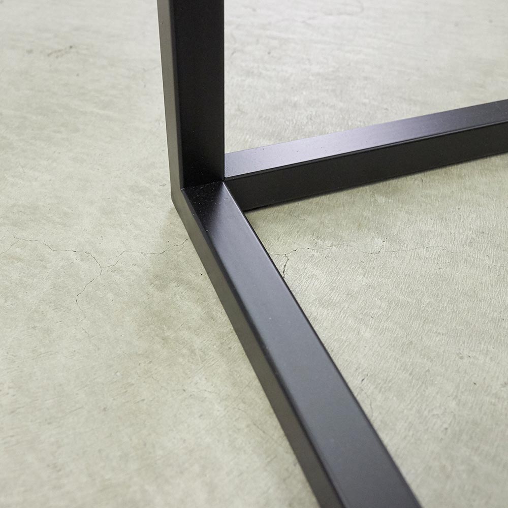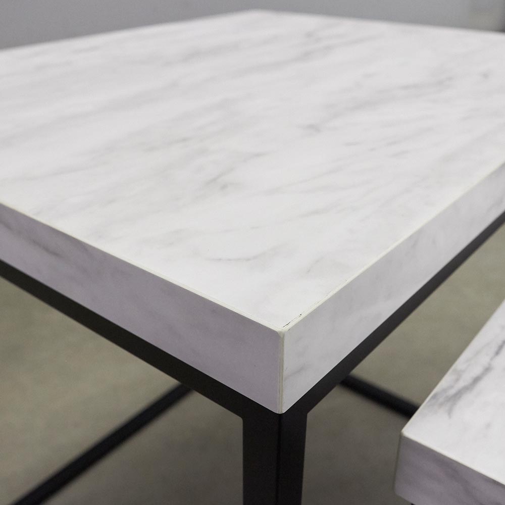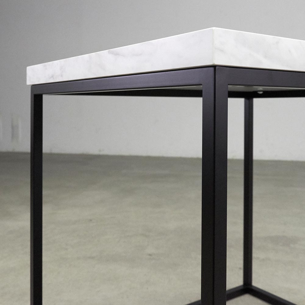 シンプルながら、石目調の天板とブラックスチール脚。2つの素材のコントラストがシックな輝きを添えます。お洒落でモダンな大理石調の天板が、印象的な空間を演出します。