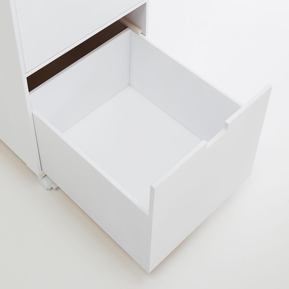 ●狭いサニタリーや洗面所、洗濯機周りで活躍するスリムな薄型収納です。●歯ブラシなどの洗面台周りの小物ストックは引き出しへ。
