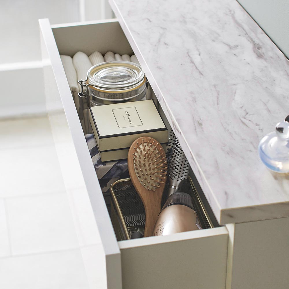 歯ブラシなどの洗面台周りの小物ストックは引き出しへ。