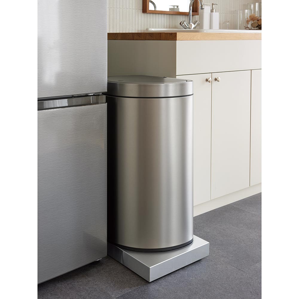 ステンレス製のごみ箱にもお似合いのスマートさ。浮かせる収納をすれば、日々の家事がラクになります。画像は幅45×奥行30cm。