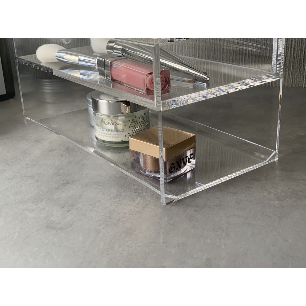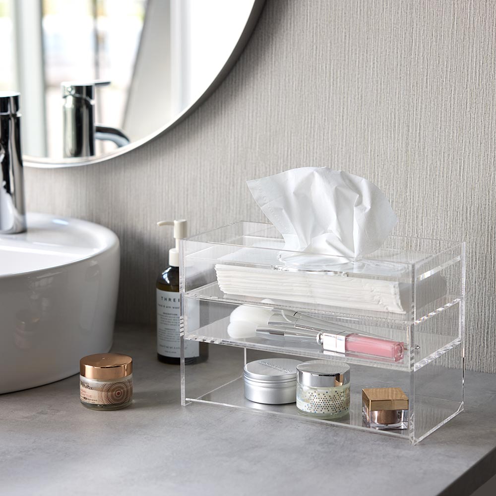 アクリルを使用しているので水回りでの使用もおすすめ。下段には日々使用するクリームのジャーなどを入れるのにとても便利。滑らせるように取り出すことが可能です。引き出しにはブラシやリップなどを入れてコスメ入れとしての使用も。