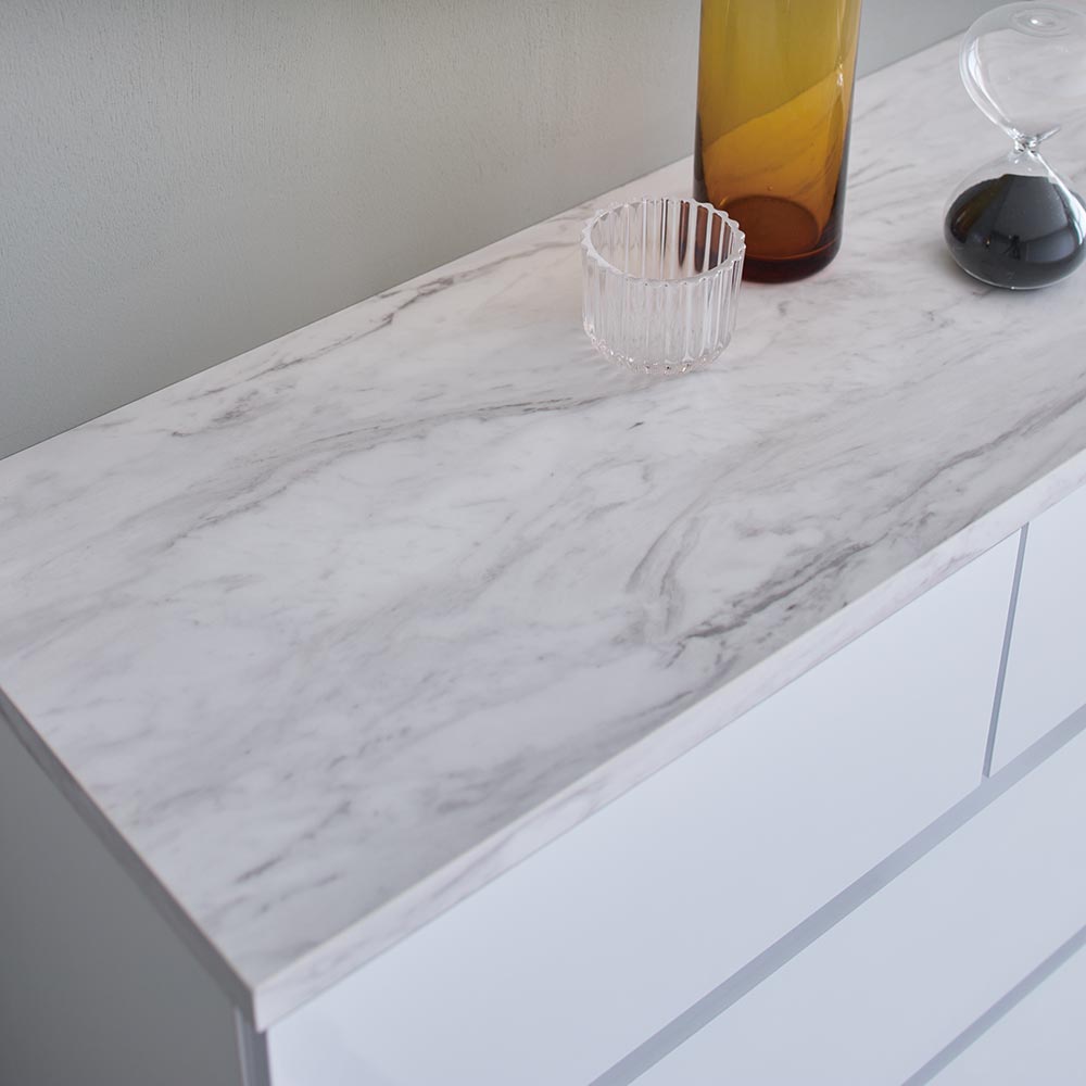 天板はエレガントなマーブル模様の大理石調素材。水や熱、汚れにも強いので、長くきれいに使えます。