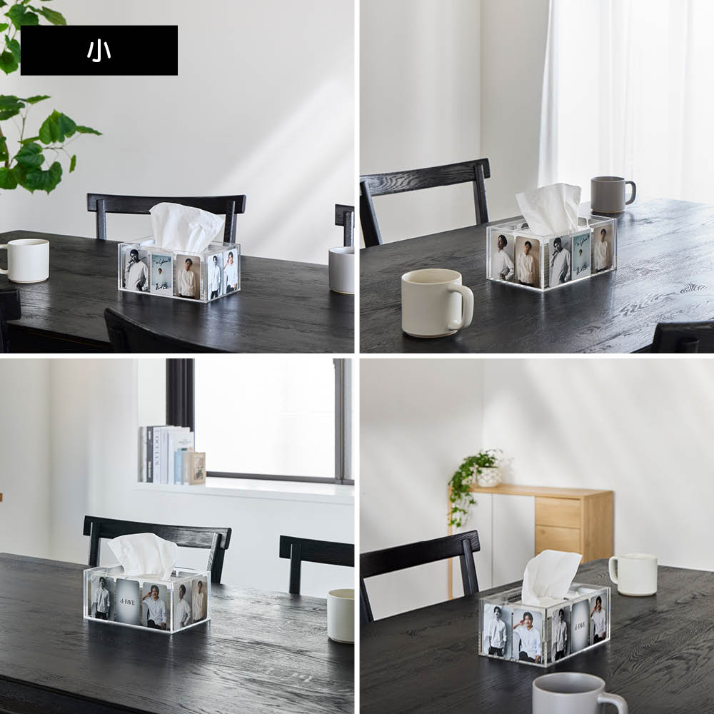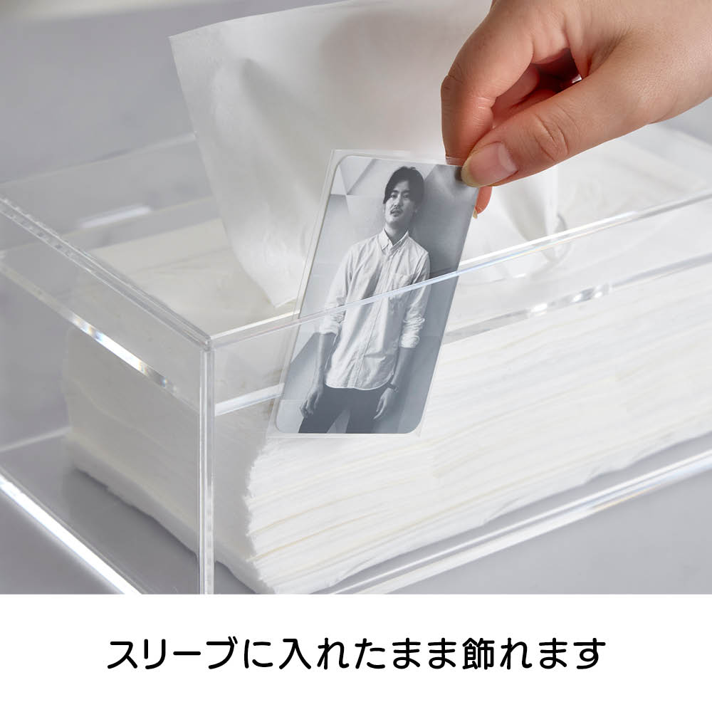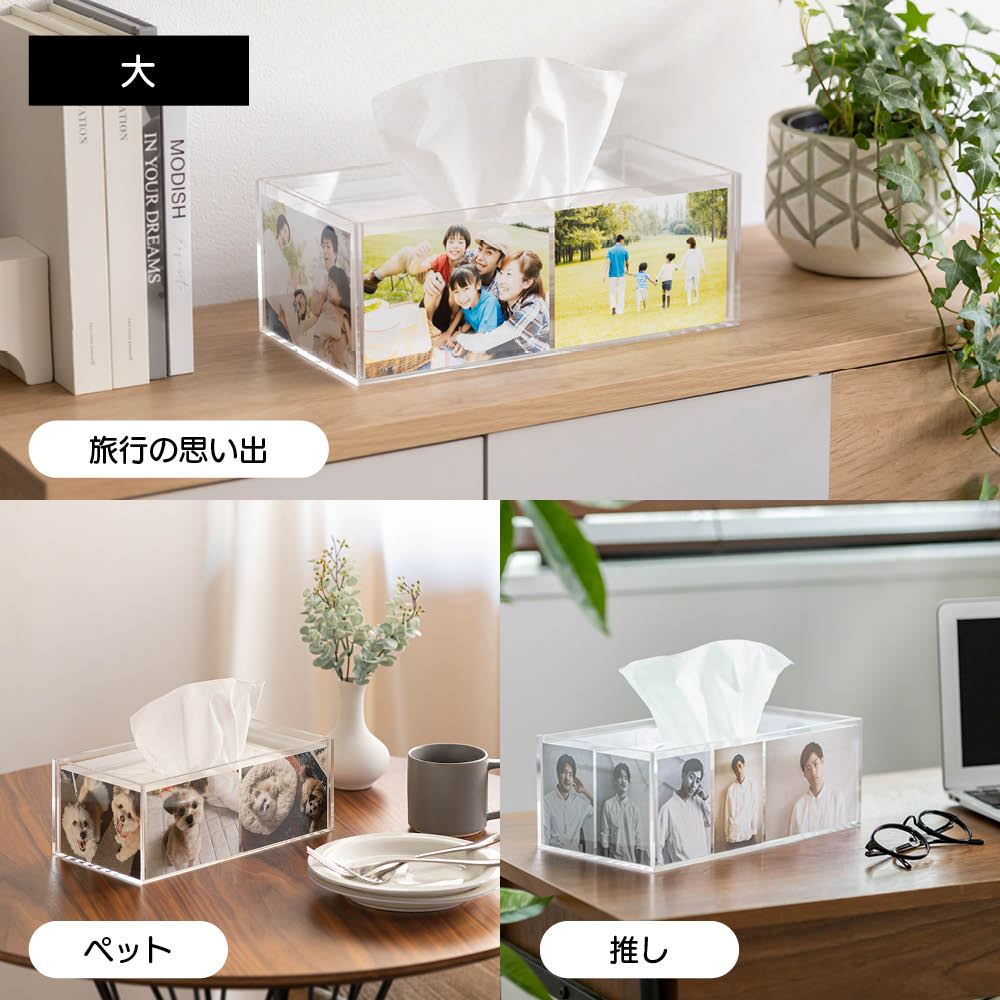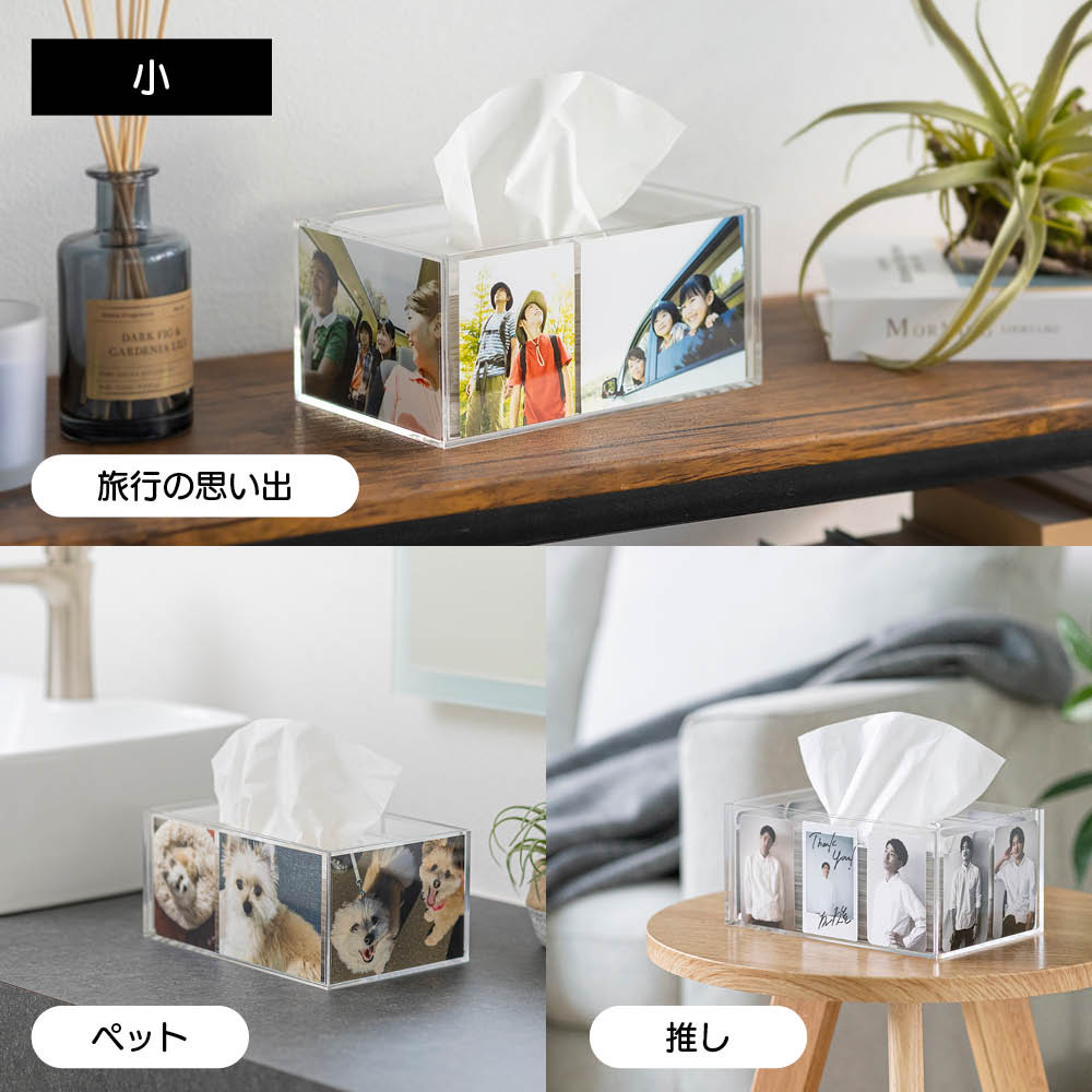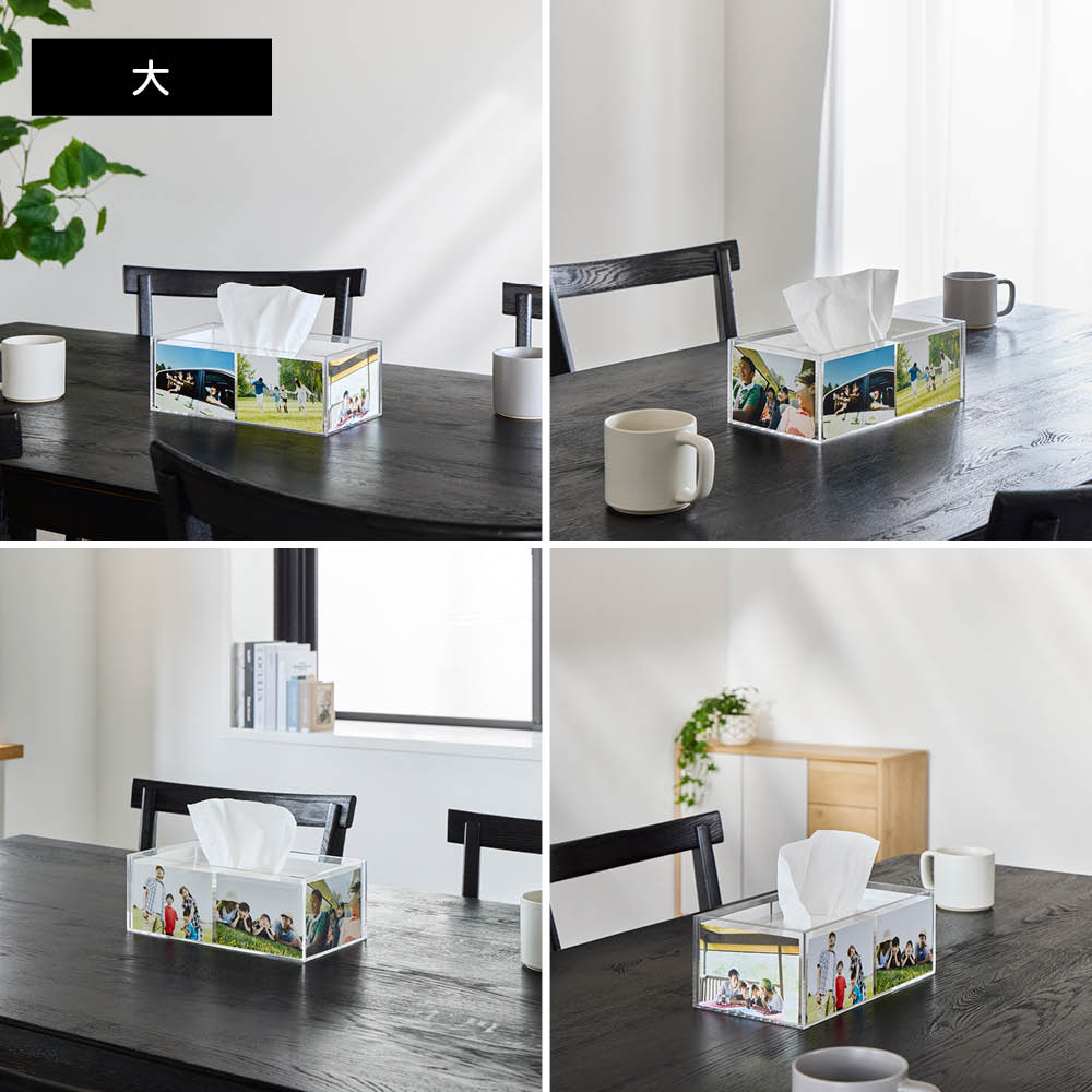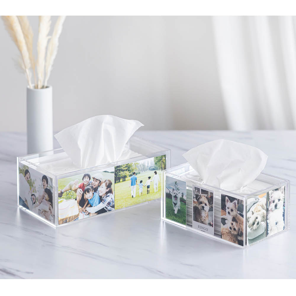 透明感が美しいアクリル製のティッシュボックスにお気に入りの写真を挟めば、世界で一つのティッシュボックスに。ティッシュを使うたびに目に入るので楽しく、省スペースで飾れてお部屋もすっきり。