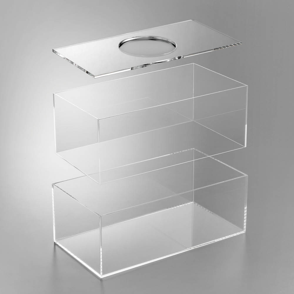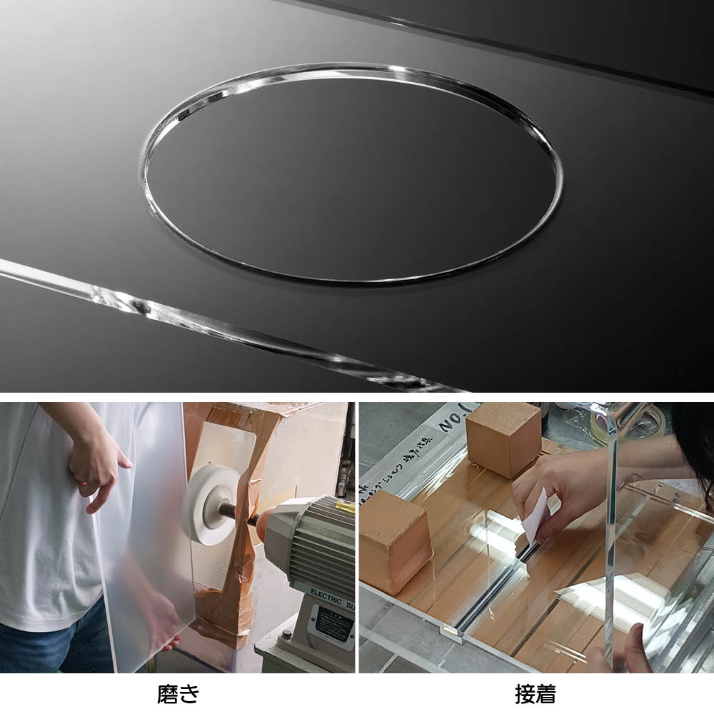 透明度の高い国産アクリル板を使用。ものづくりの技術に定評のある新潟・燕三条エリアの工場で、熟練の職人が一つひとつ丁寧に手磨きしているので、角まで滑らかで美しい仕上がりです。商品画像の説明