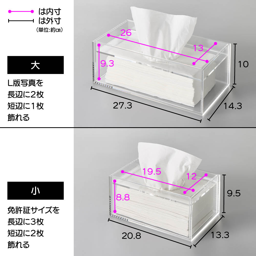 ■小:ソフトパックティッシュ対応、大:箱ティッシュ対応(全てのティッシュには対応しませんので、事前に内寸サイズをご確認ください)