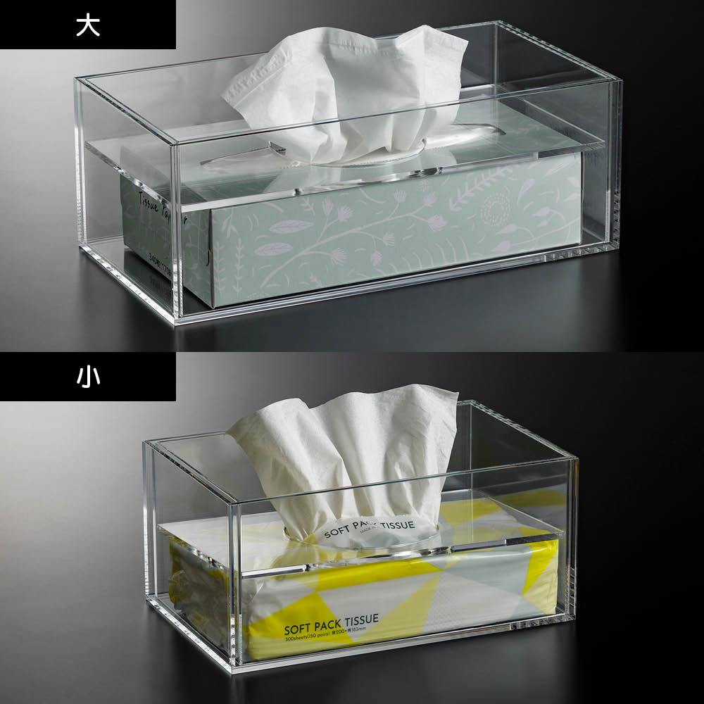 大は箱ティッシュ、小はソフトパックティッシュに対応したサイズ。180組のものなら2セット入れられます。