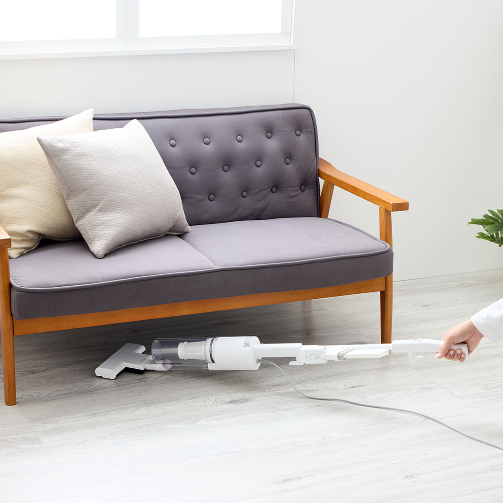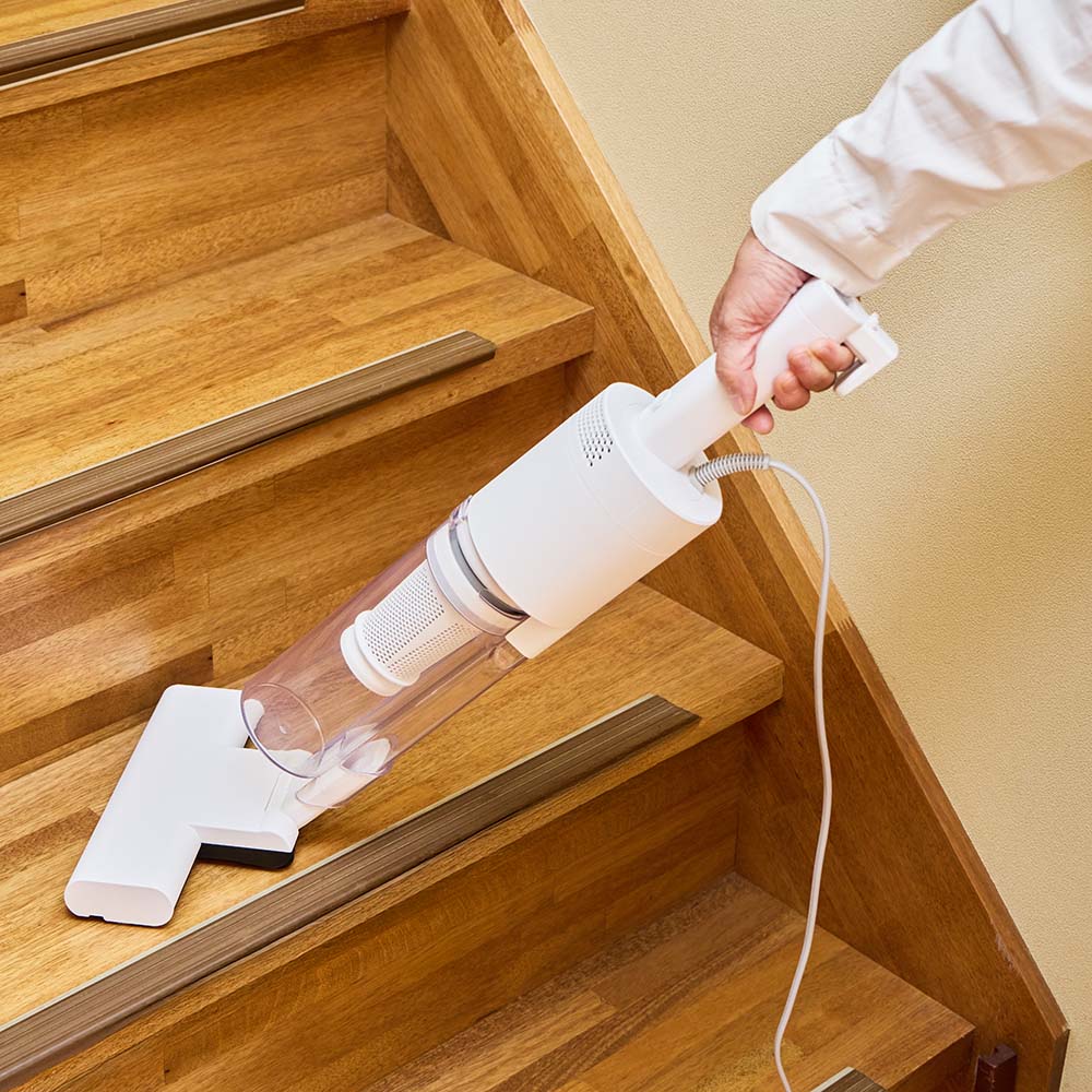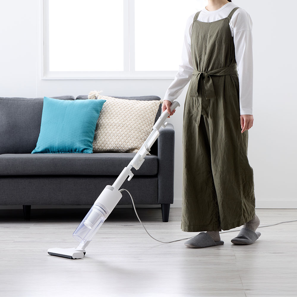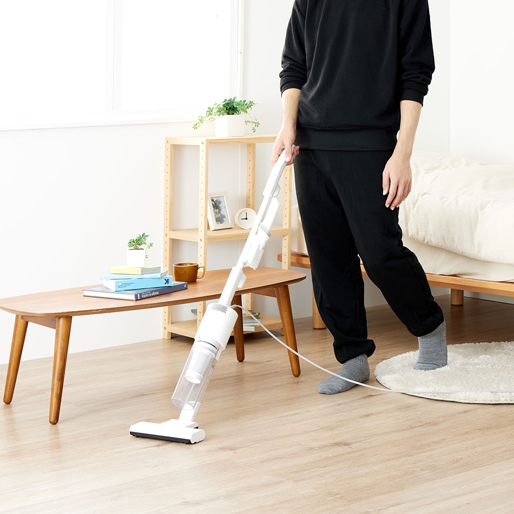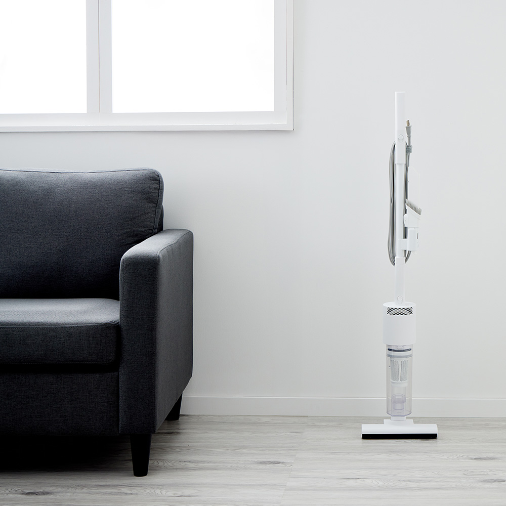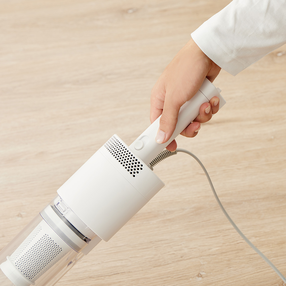 吸引仕事率100Wのハイパワーで、ペットの毛やホコリ・パンくず・砂粒までも確実に吸引。コード付きだから、掃除中にパワーが弱まることがありません。バッテリー残量や充電時間を気にせず、「今すぐ掃除したい」と思った時にストレスフリーで使えます。製品重量は約1.7kg。しかし重心設計にこだわり、手にかかる重さはわずか400g。500mlのペットボトルよりも軽い重さで取り回しは自在。6.0mロングコードで快適掃除。10畳のお部屋(対角約6.1m)ならコンセントを差し替えることなく一気にお掃除が完了。ブラシレス構造なので毛が絡まず吸引力が落ちません。自立しますので、出す→使う→しまうの流れがワンアクションで完結。インテリアを邪魔しないオールホワイトのミニマルデザインです。
