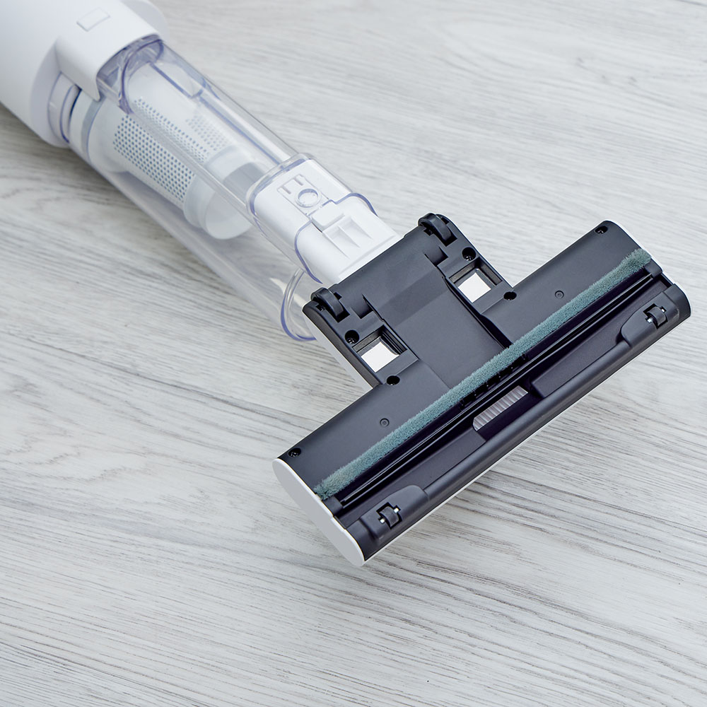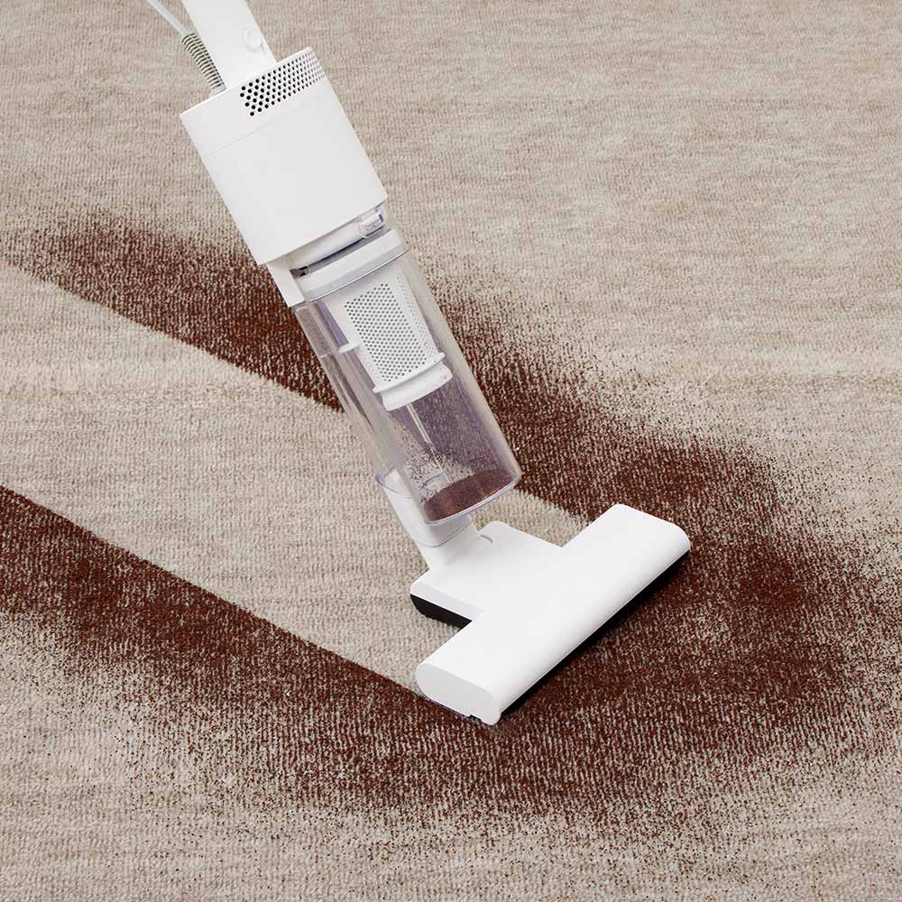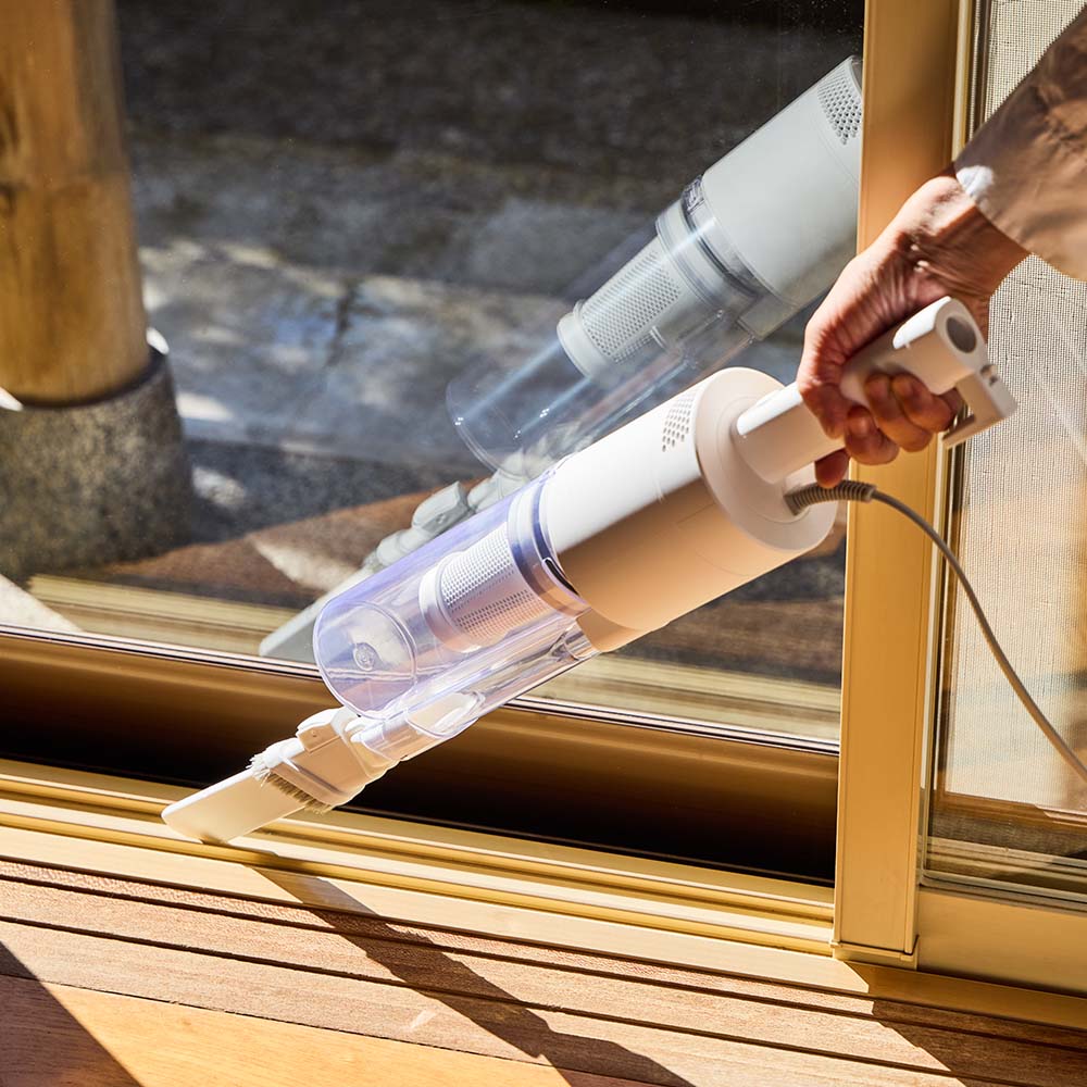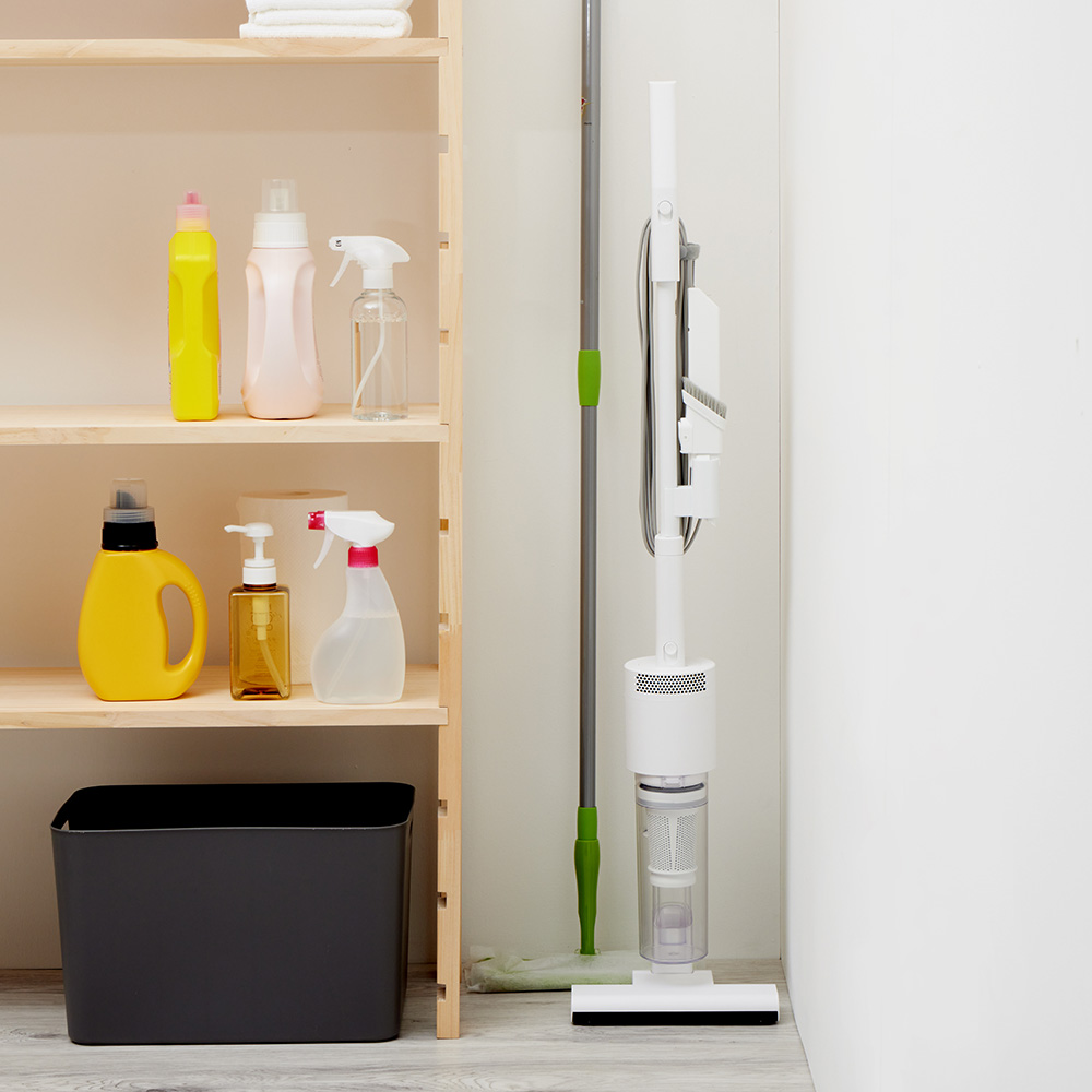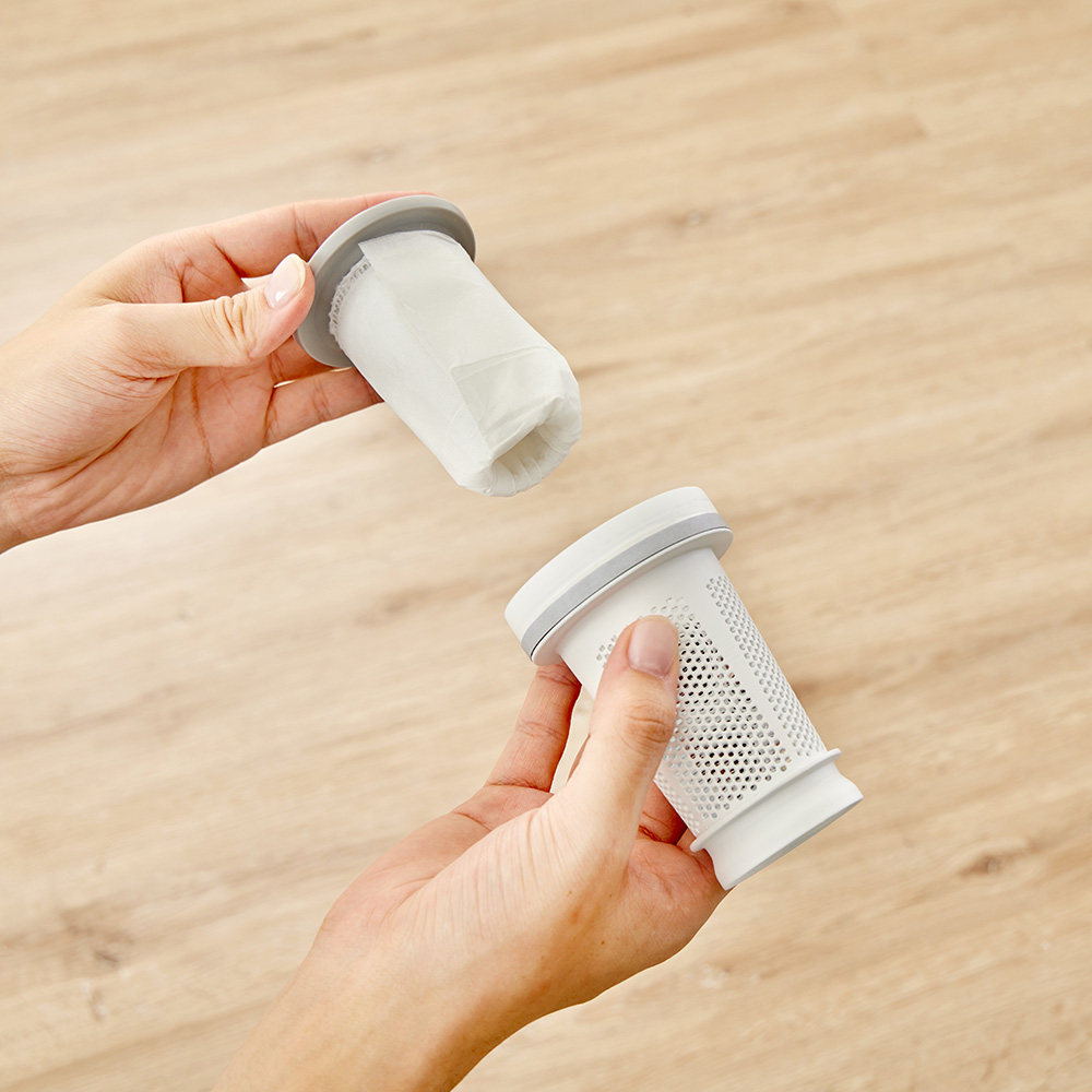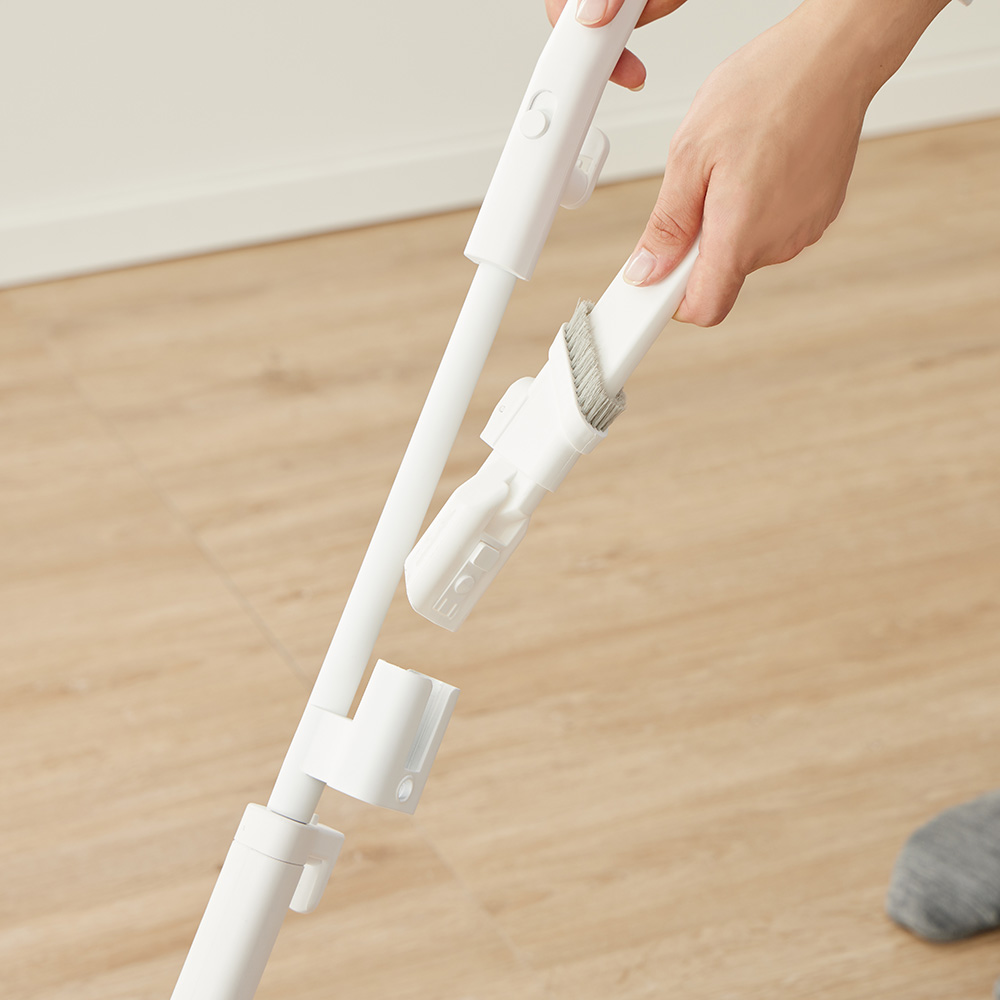 吸引仕事率100Wのハイパワーで、ペットの毛やホコリ・パンくず・砂粒までも確実に吸引。コード付きだから、掃除中にパワーが弱まることがありません。バッテリー残量や充電時間を気にせず、「今すぐ掃除したい」と思った時にストレスフリーで使えます。製品重量は約1.7kg。しかし重心設計にこだわり、手にかかる重さはわずか400g。500mlのペットボトルよりも軽い重さで取り回しは自在。6.0mロングコードで快適掃除。10畳のお部屋(対角約6.1m)ならコンセントを差し替えることなく一気にお掃除が完了。ブラシレス構造なので毛が絡まず吸引力が落ちません。自立しますので、出す→使う→しまうの流れがワンアクションで完結。インテリアを邪魔しないオールホワイトのミニマルデザインです。