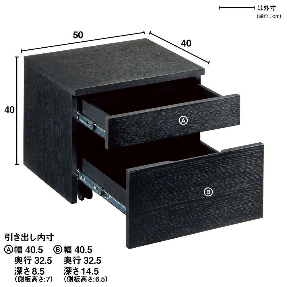 ■引出内寸:上段…幅40.5奥行32.5高さ8.5(側板高さ7)cm、下段…幅40.5奥行32.5高さ14.5(側板高さ6.5)cm