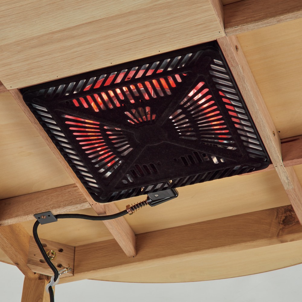 体を芯から暖めてくれる、薄型石英管ファンヒーターを採用。リビングテーブルとしても。