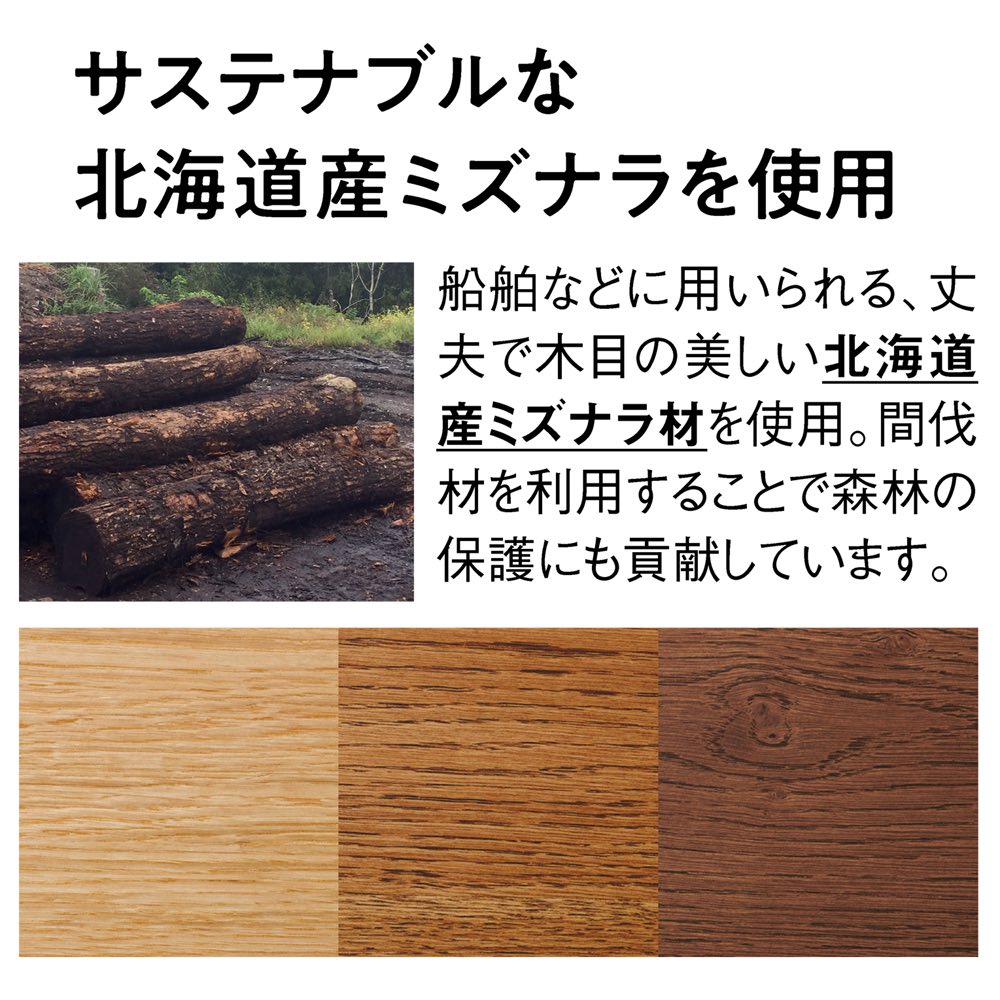 船舶などに用いられる丈夫な北海道産ミズナラ材をふんだんに使用。間伐材を利用することで森林の保護にも貢献しています。