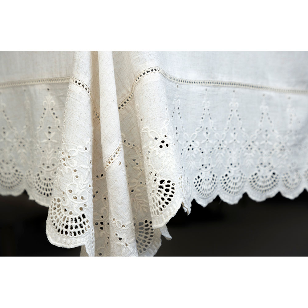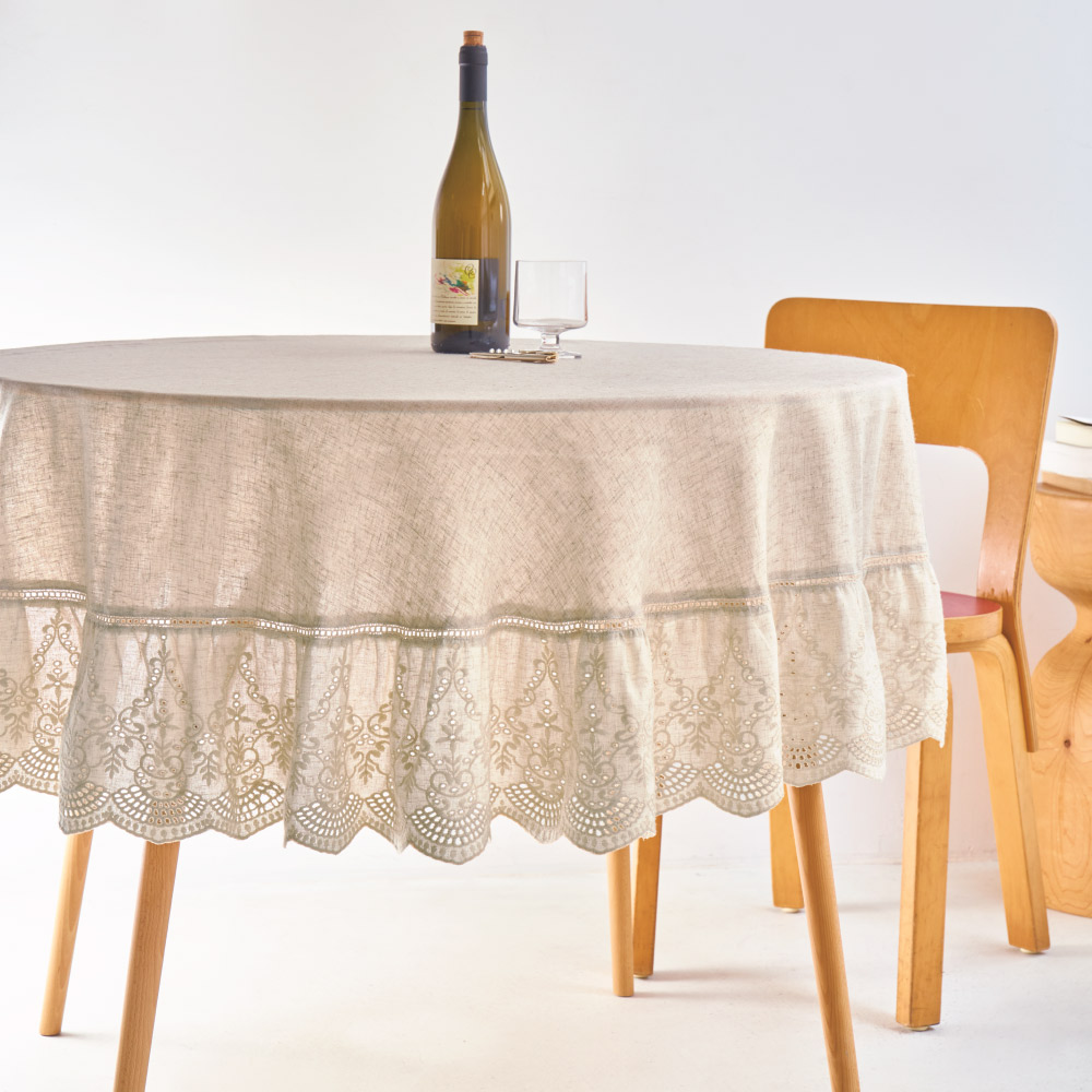 繊細なカラーでも撥水仕様だから水や汚れがしみにくく、毎日の家事やおもてなしにも安心。麻混の自然素材と機能性を兼ね備え、暮らしに寄り添います。上品なレースがエレガントな食卓に