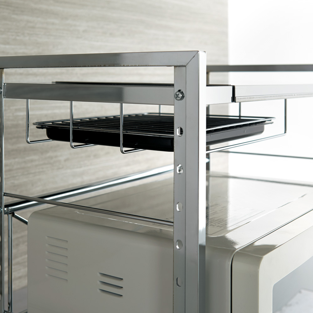 天板耐荷重が20kgもある頑丈ラック。調理中に使用する調味料やキッチン小物、パンやコーヒー関係からお鍋のデザイン性の高いホーロー鍋のディスプレイも可能です。棚板下のラックは、オーブントレーや網、ラップなど置き場所に困るものの収納に便利。さらに下のスペースには、電子レンジやトースター、炊飯器などの調理家電をまとめて収納することができ、狭かったスペースが広々と使えます。スペースに合わせて設置可能なサイズ設計