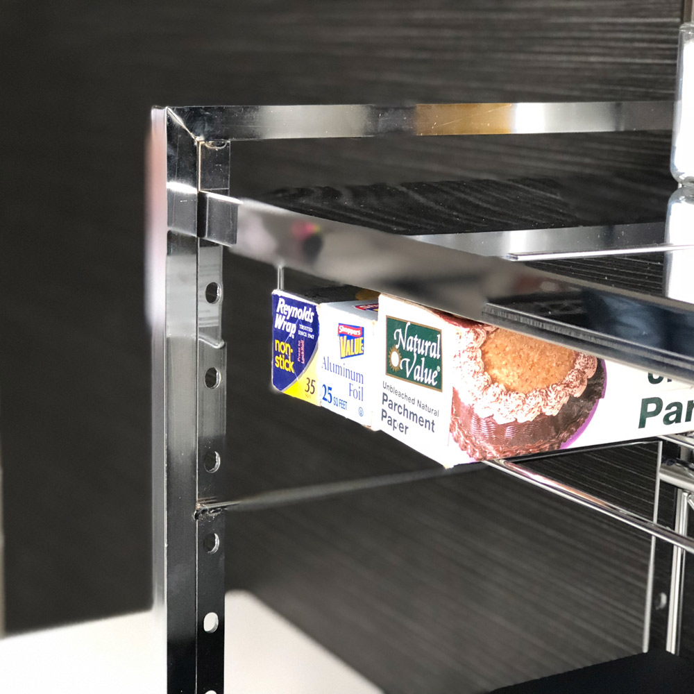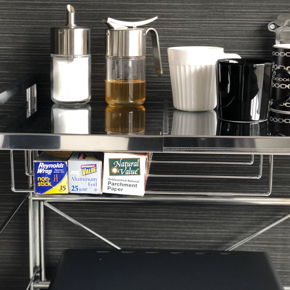 棚板下のラックは、オーブントレーや網、ラップなど置き場所に困るものの収納に便利。