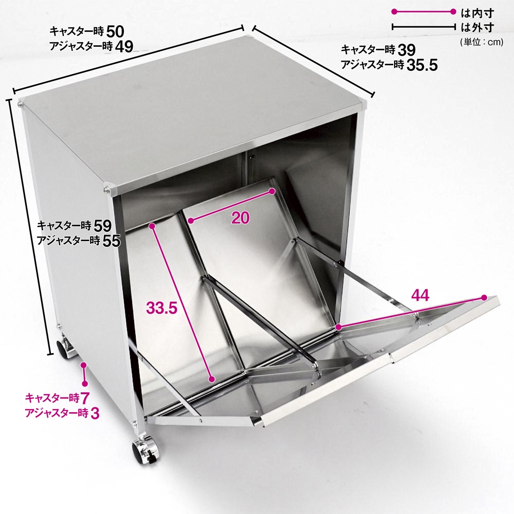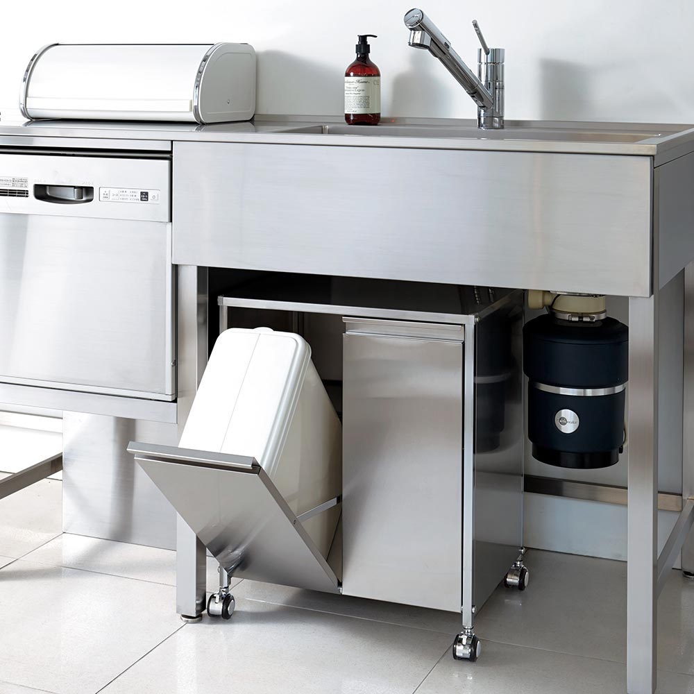 • シンク下の空いたスペースをダストボックスやストック品の収納に有効活用できます。 (外寸cm)幅49×奥行35.5×高さ55   (キャスター取り付け時の外寸cm)幅50×奥行39×高さ59