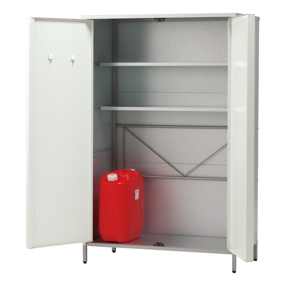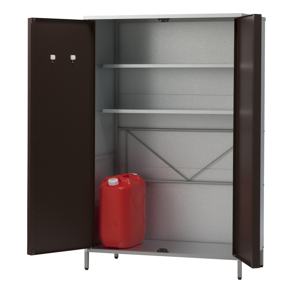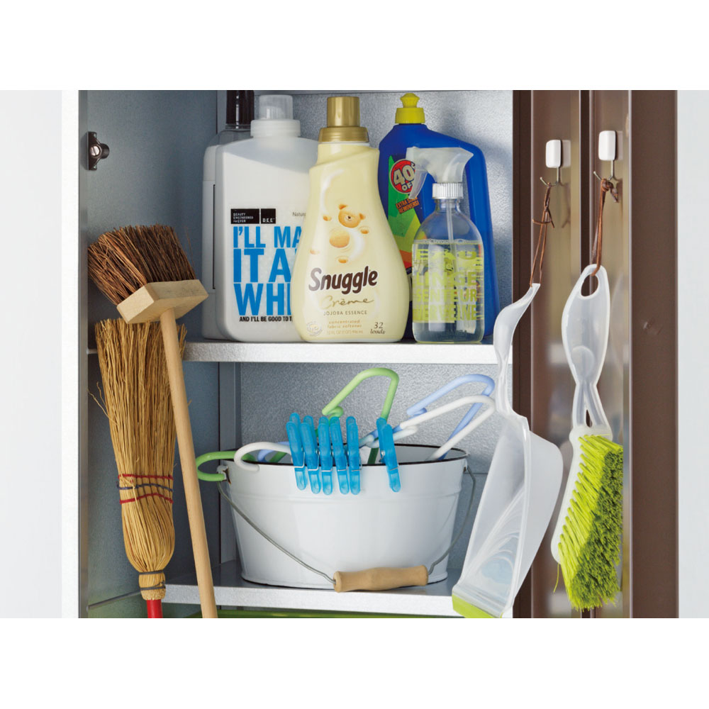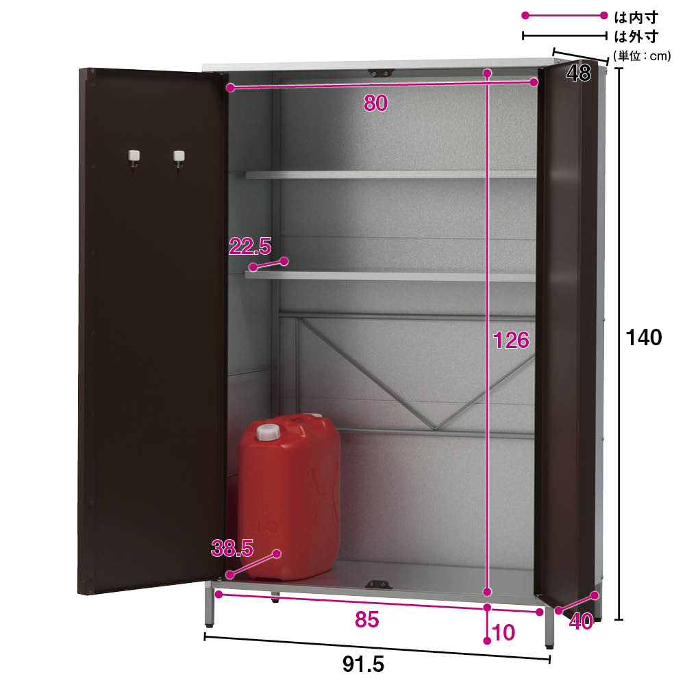 ポリタンクも収納できる、頼れる収納力も自慢。棚板は奥行きが浅めのつくり。棚板と扉の間にスペースがあるので、長い柄のものを収納することができます。