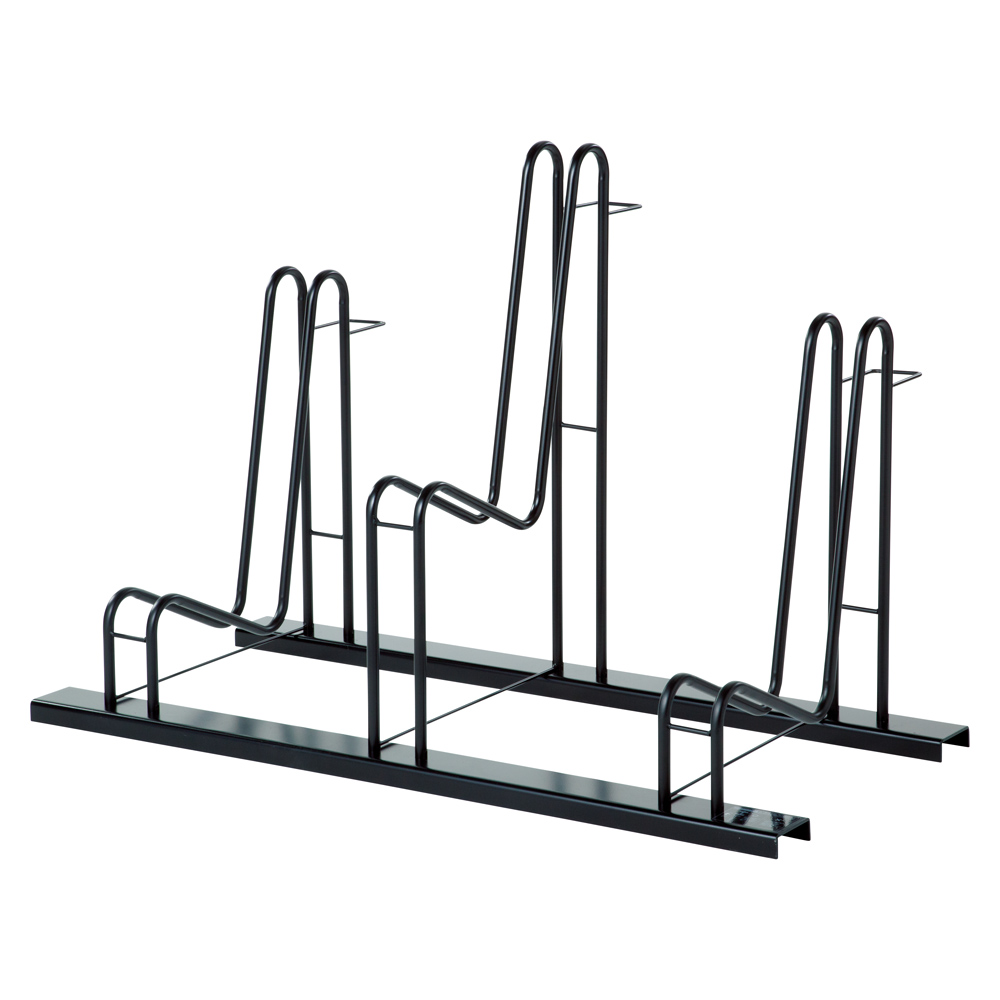 公共の駐輪スペースにあるような本格仕様で、しかも3点で支えるので自転車が左右にフラつきません。2台用タイプ・3台用タイプは高低差のあるつくりで、2台・3台の自転車を省スペースで保管できます。