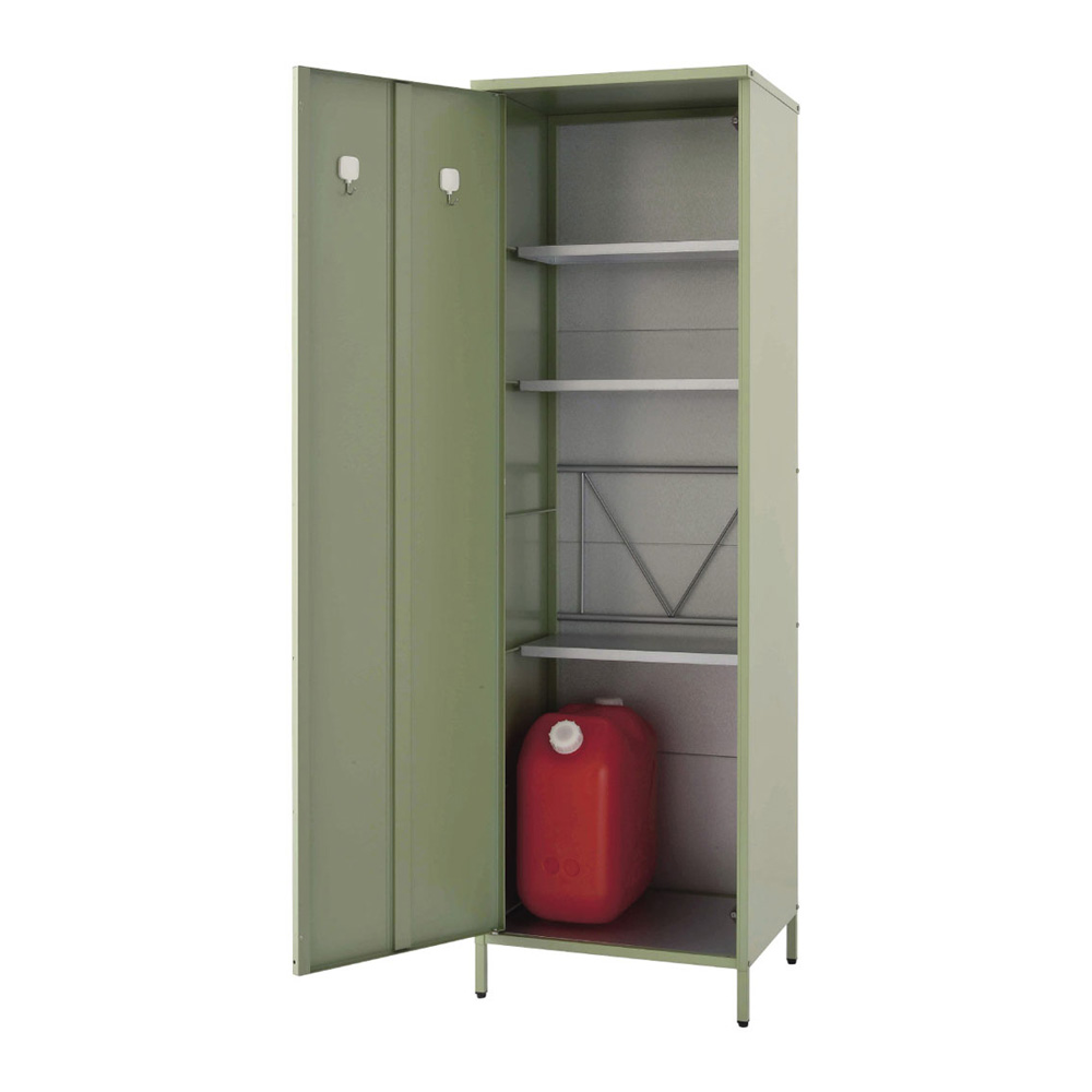 セージグリーン スリムタイプ。わずかなスペースも収納に活用できます。棚板の手前には柄の長いツールが収納可能。
