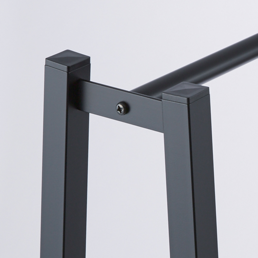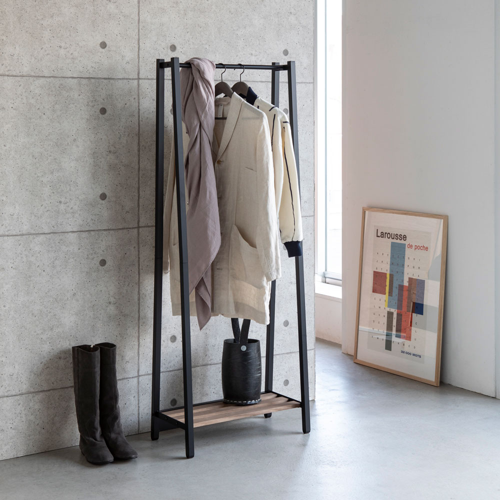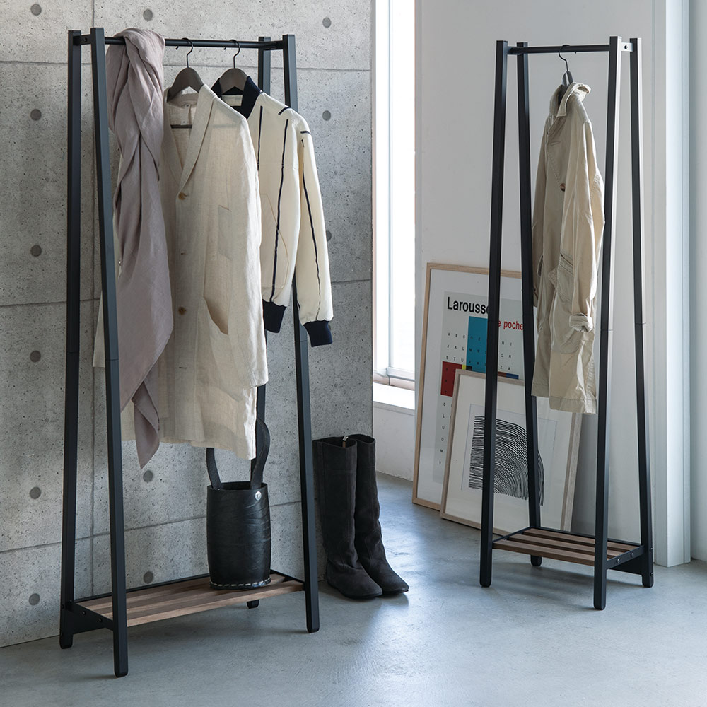 丈夫な角パイプを高級感のあるつや消し塗装で、シンプルなAラインのハンガー。木目を生かした、棚板を合わせてシックでシンプルに。