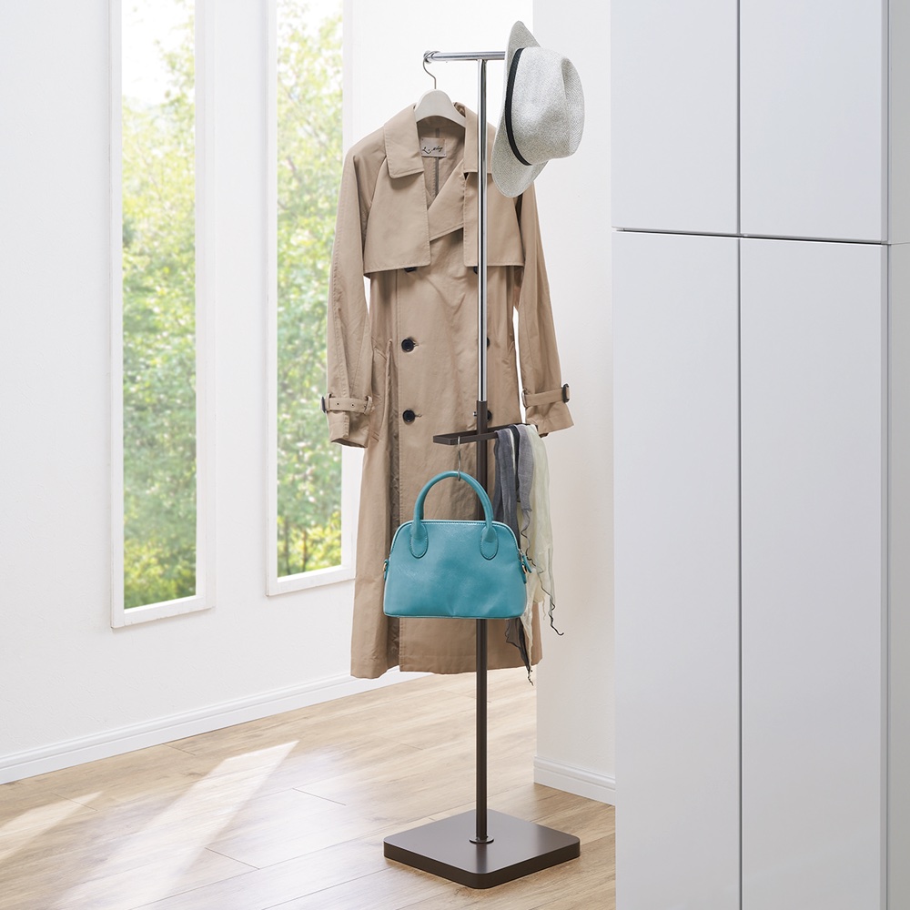 • (イ)ダークブラウン 中段のバッグ、小物掛けもとっても便利。ダブルタイプも省スペース。ご家族のちょい掛けハンガーに。 ※商品画像はダブルタイプです。