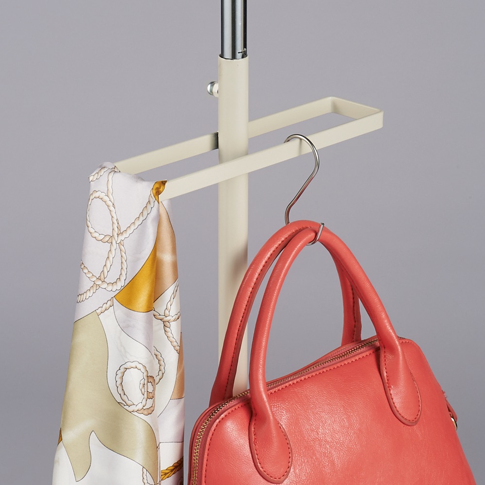 中段にある長方形の小物掛けもできるハンガーバーには、カバンやリュックはもちろん、マフラー、ストールなども掛けられます。パンツハンガーに掛けたパンツやスカートの置き場としても。小物掛け部分の耐荷重も約5kg。