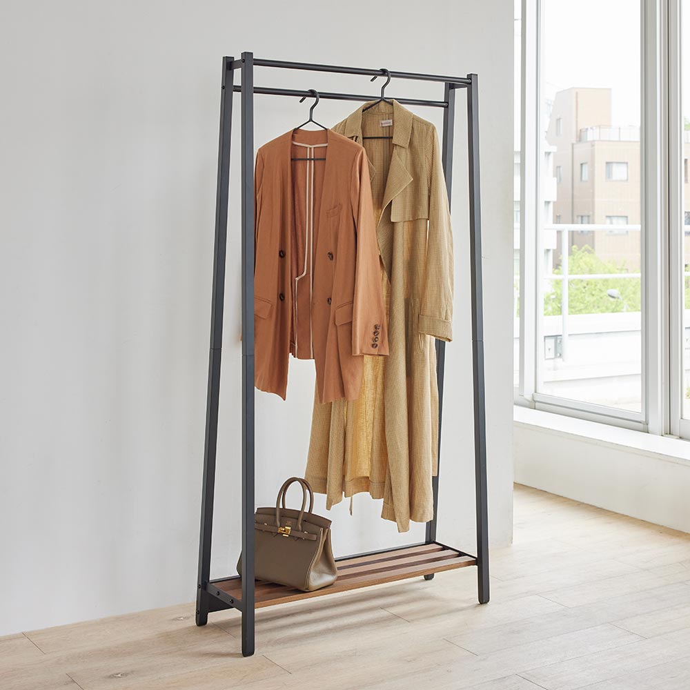 お客様の声にお応えして生まれた頑丈ながらスタイリッシュに仕上げたハンガーラック。80cm幅ならコーディネートで選びたいコートや羽織など満足に掛けられるサイズ。スリムなAライン設計なので圧迫感のないつくりです。壁に沿わせて設置すればおしゃれな店舗のような空間に。