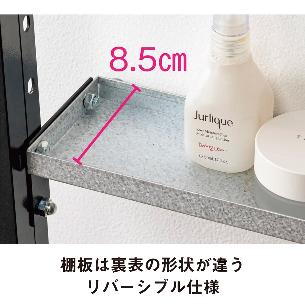 棚板は収納物に合わせて2通りの使い方ができるリバーシブル設計。立ち上がりのあるトレー型(奥行内寸8.5cm)なら洗剤ボトルも安定して置けます。反対にフラット型(奥行内寸9cm)にすれば、タオルや箱ティッシュの収納に最適。
