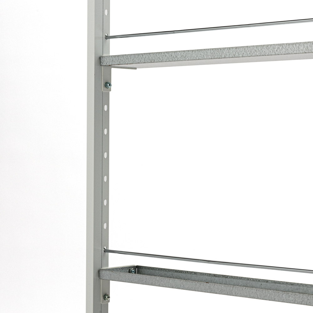 ■素材:本体…スチール(メラミン焼付塗装)、棚板…ガルバリウム鋼板、こぼれ止めバー…スチール(クロムメッキ)