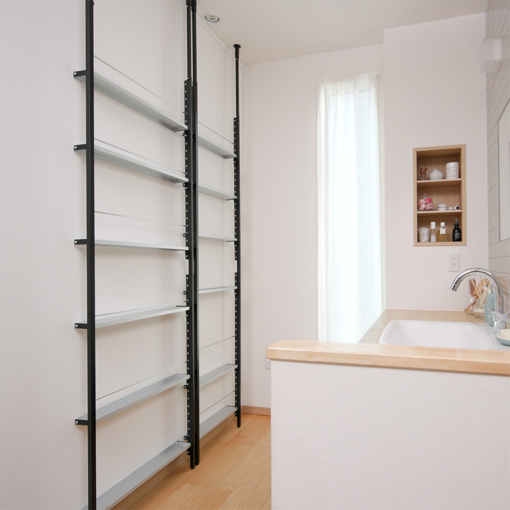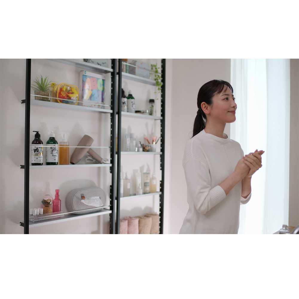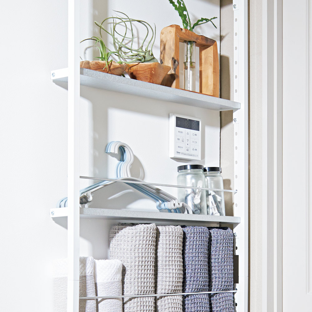 湿気が多い場所でも使える素材選びにもこだわりました。棚板には湿気に強いガルバリウム硬板を採用。これにより、洗面所などの水回りでも安心してご使用いただけます。30年以上のお付き合いがある開発パートナーの確かな技術と経験により、使いやすさと耐久性を兼ね備えた実用的な商品へと仕上げています。
