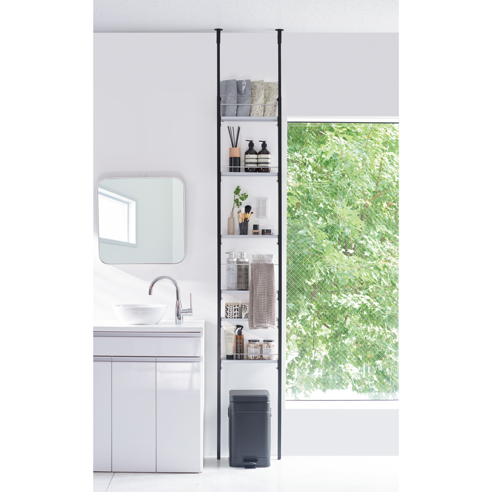 奥行約12cm(突っ張り部分含む)という超薄型設計で、これまで収納を諦めていた狭いスペースにも設置できます。本体奥行は10.5cmながら、天井までの高さを活かした収納力が魅力です。幅40cm・55cm・70cmの3サイズから選べ、高さは215~260cmまで調節可能。スチール製フレームで安定感があり、湿気の多い洗面所でも安心して使える頑丈な造りです。