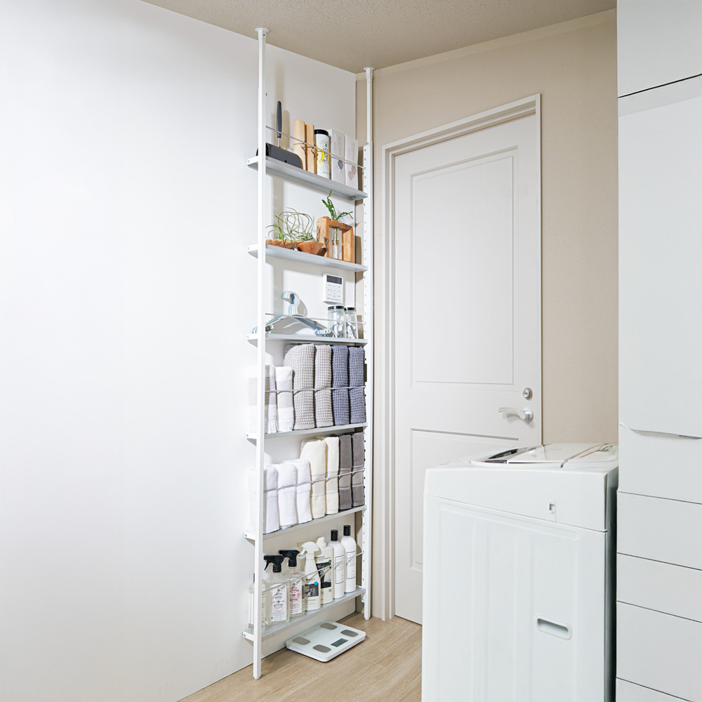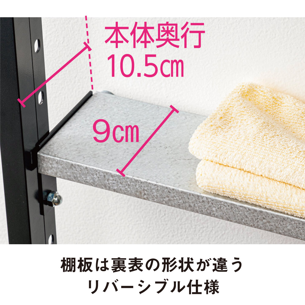 収納に悩む日常から生まれた、本体奥行わずか10.5cmの超薄型ラック。「置けない」を「置ける」に変える、そんな思いを形にしました。洗面所や玄関の壁際、これまで活用できなかった狭いスペースが、天井まで使える収納空間に変わります。湿気に強いガルバリウム棚板、4cmピッチで調整可能な6段の棚、さらには落下防止のこぼれ止めバー。すべてが「ちょうどいい」収納を目指して。お客様の「あと少し足りない」を解決する一台です。
