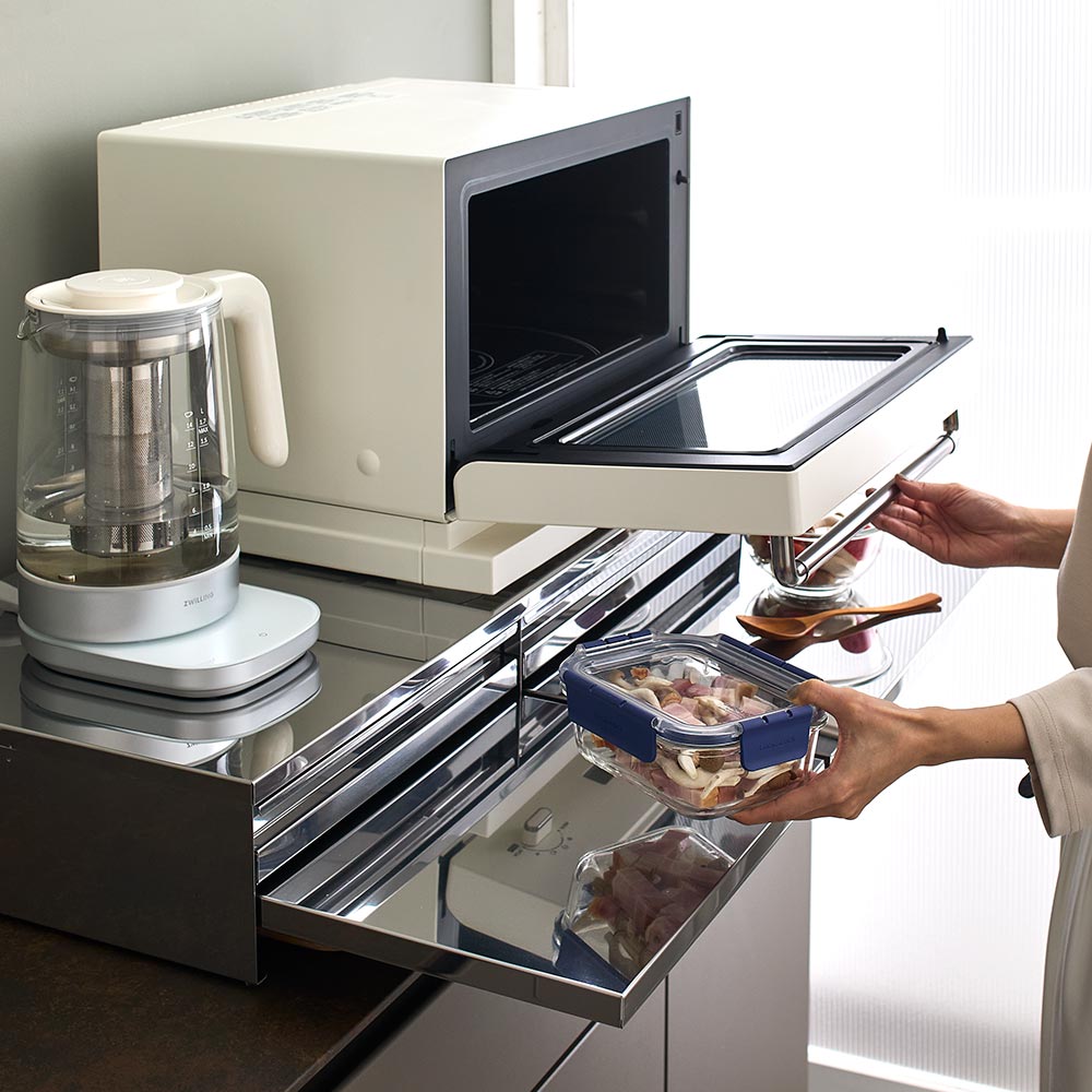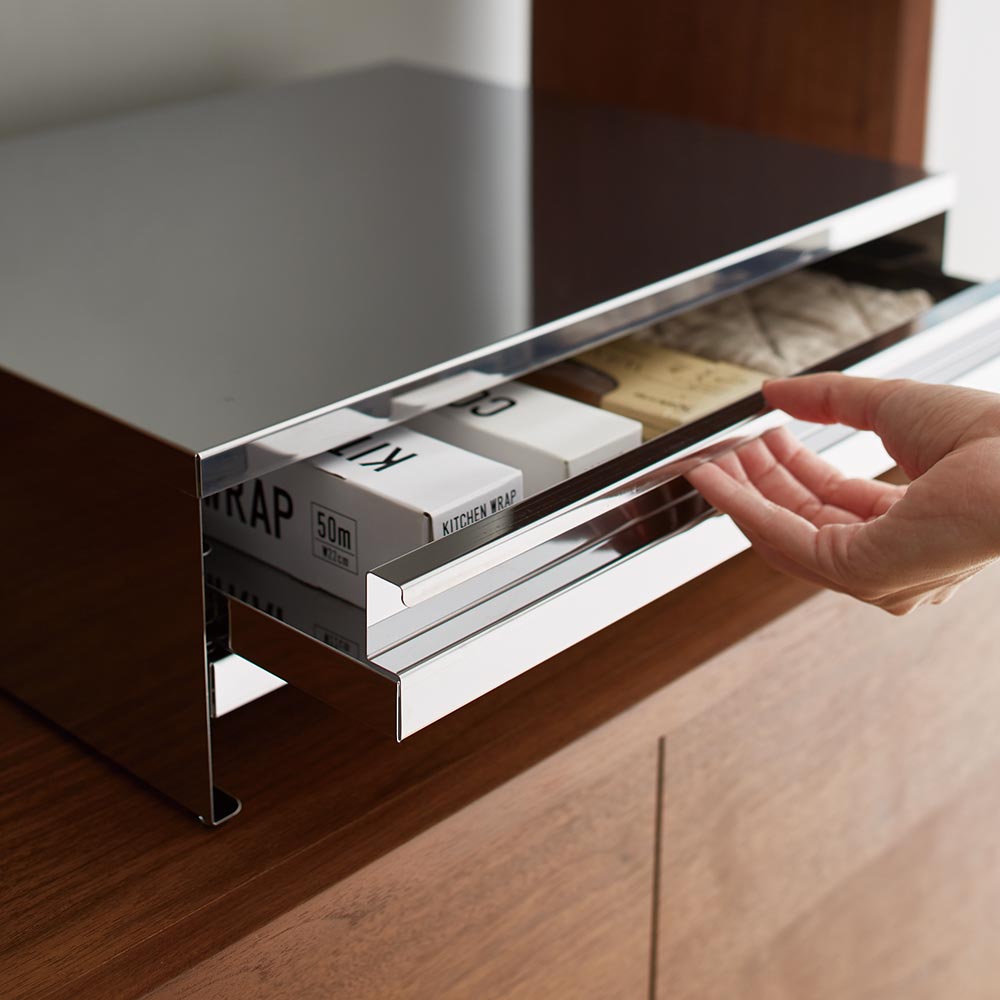 深さ5cmの引き出しがついているので、電子レンジであたため時によく使うラップやミトン、カトラリー類をしまうのにおすすめ。(※引き出し付きのみ)2:ラップをかけたい時に作業台がサッと出てくる