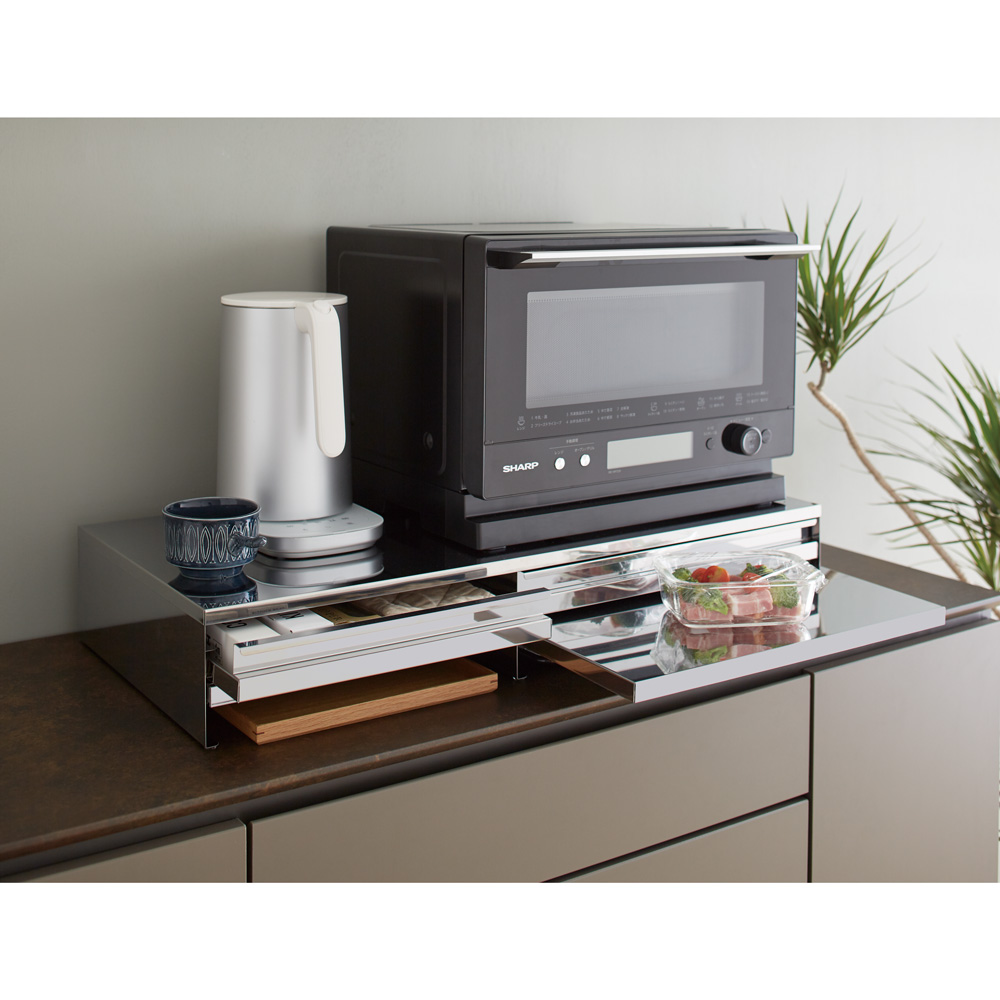 オールステンレスで作られた収納アイテム。電子レンジのあたため時に役立つラップやミトンが収納でき、作業テーブルとしても活躍します。さらに下オープン部にはオーブン機能で使う角皿が入ります◎