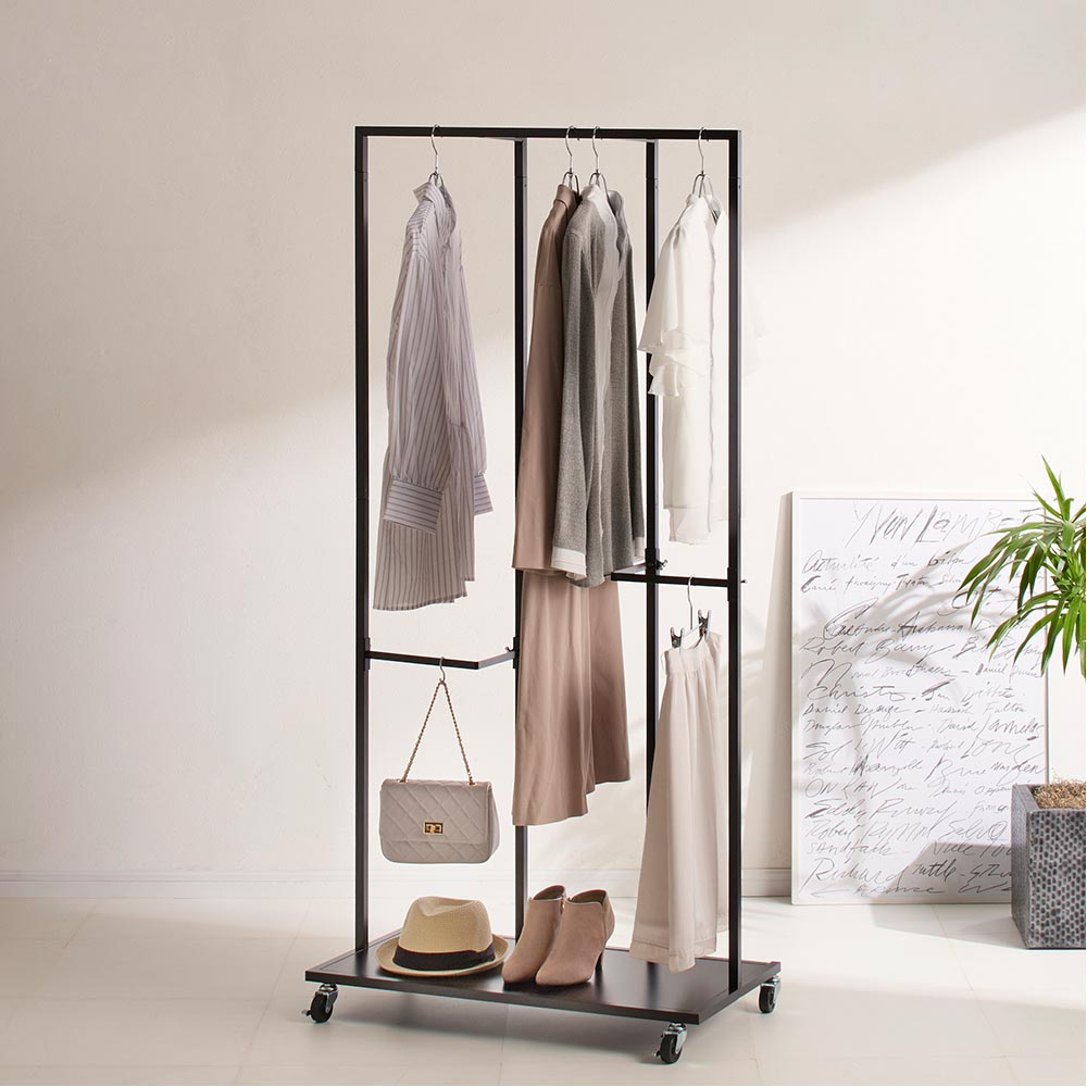 使用イメージ(イ)ブラック 手持ちの洋服や季節に応じて1段と2段を切り替え可能。 ロング丈もショート丈もこれ一台で収納できます。 ※写真は別売りの幅82cmタイプです。