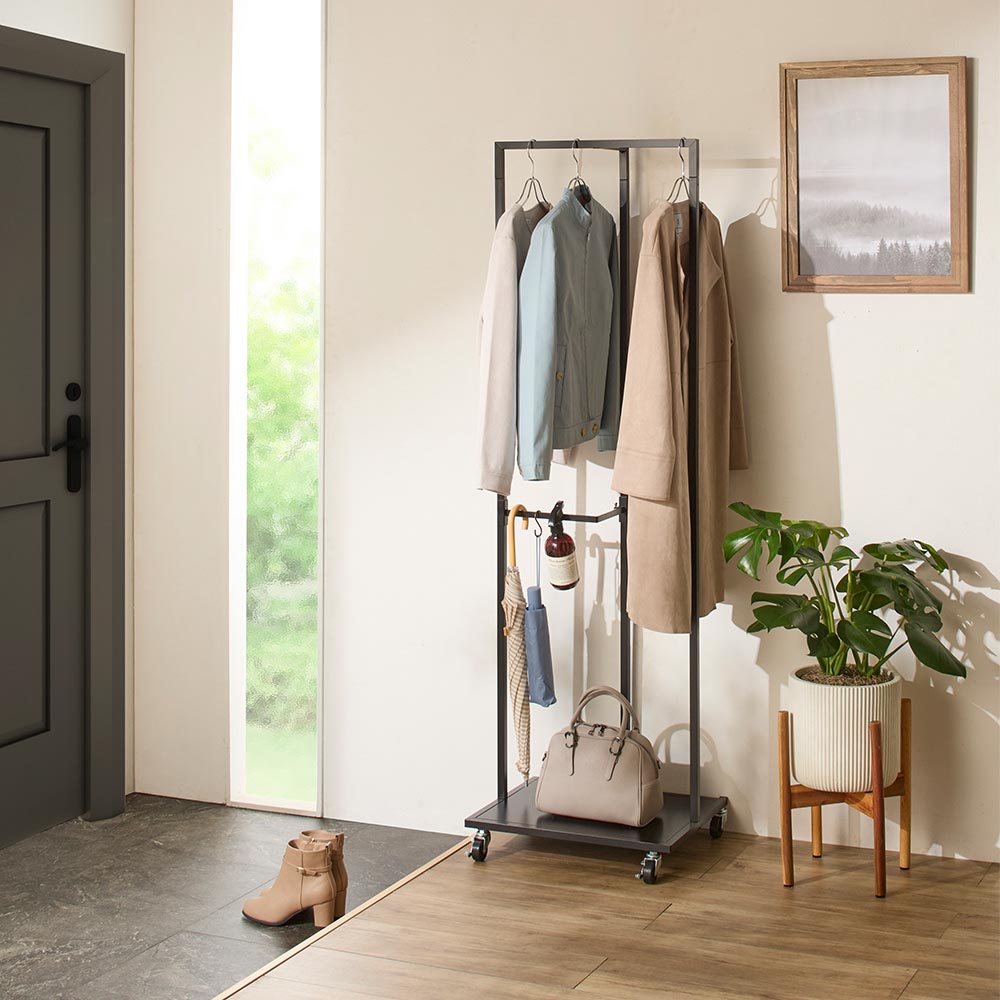 中段のL型バーは、内向きで設置すれば上下2段掛けの衣類収納にも。玄関ハンガーとして傘掛けにしたり、様々な用途に合わせて使用できます。